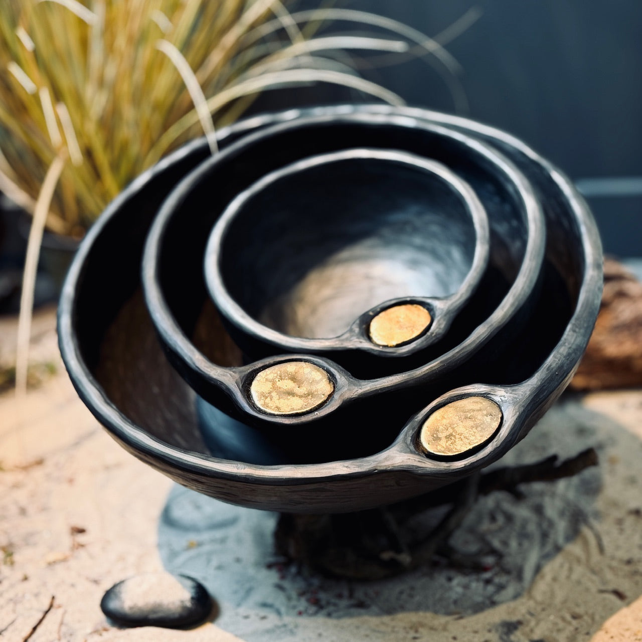 Melnās keramikas bļodas LAIVA ar koka tekstūru