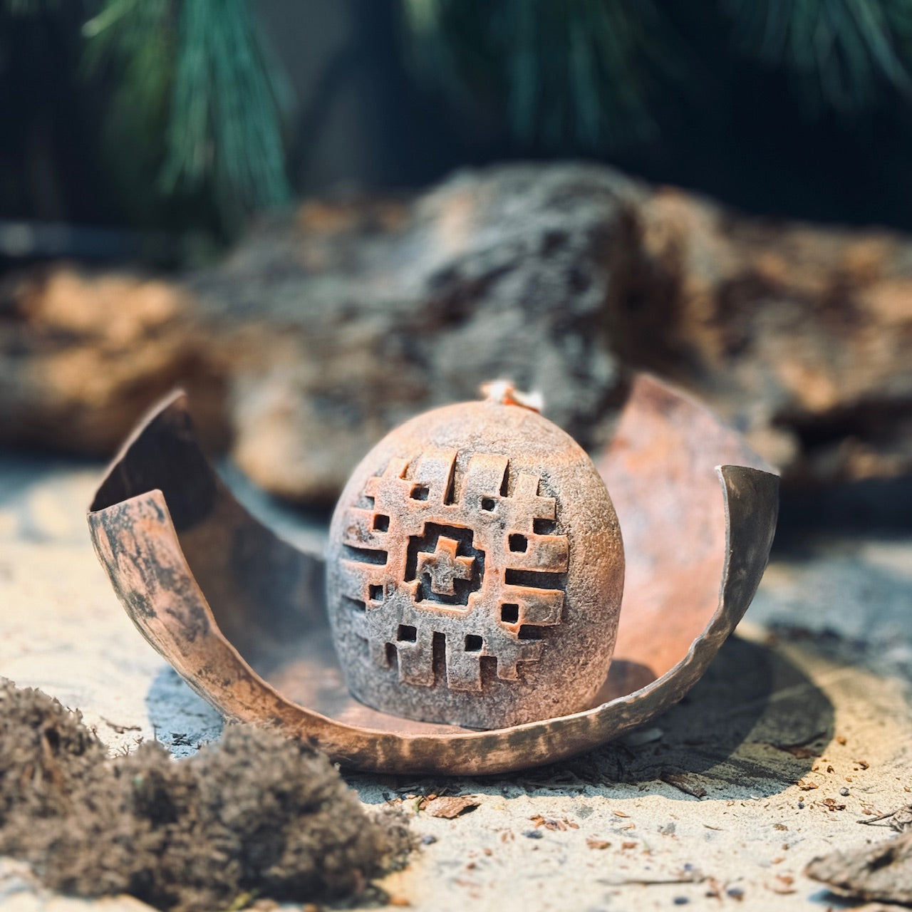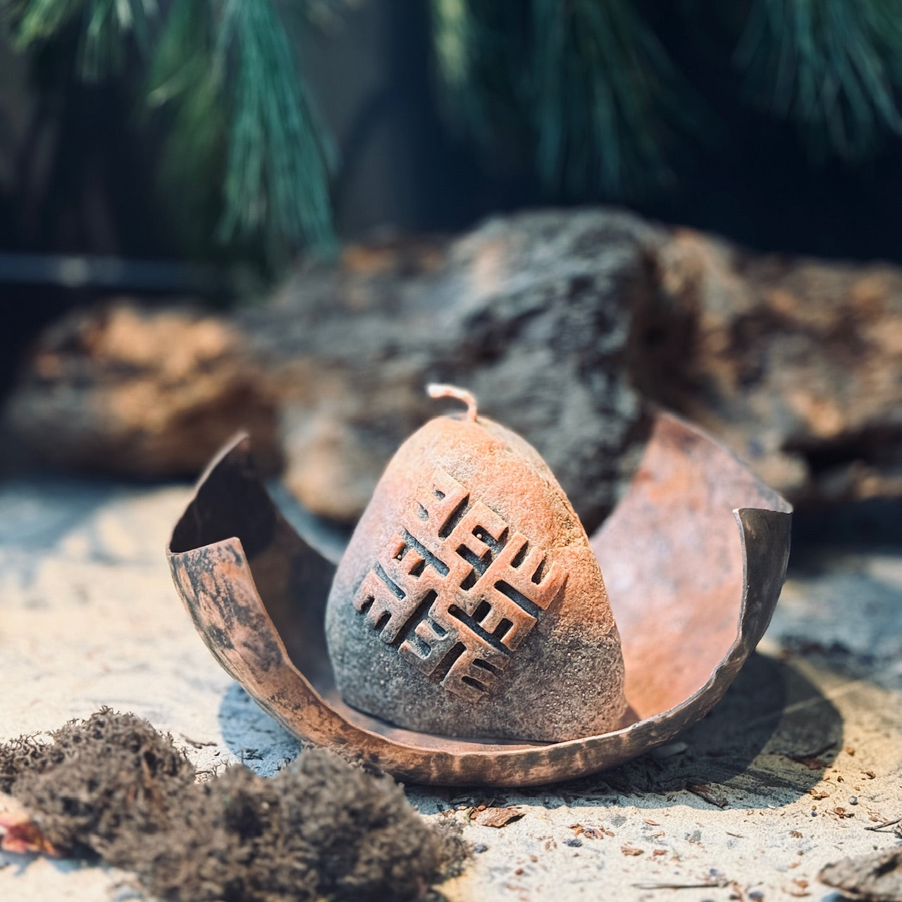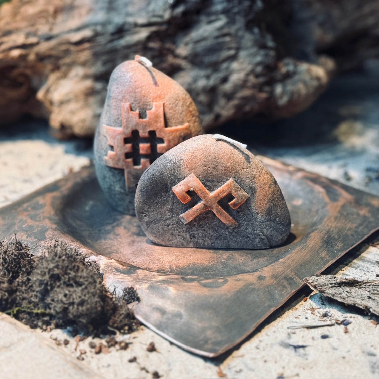 sveces tiek radītas uz dzīvas uguns enerģijas no dabai draudzīga eco augu vaska. Sveces veidotas tā, lai atgādinātu akmens virsmu un rotātas ar lATVIEŠU SPĒKA ZĪMĒM, kas nes aizsardzības, spēka un gara mantojuma nozīmi.