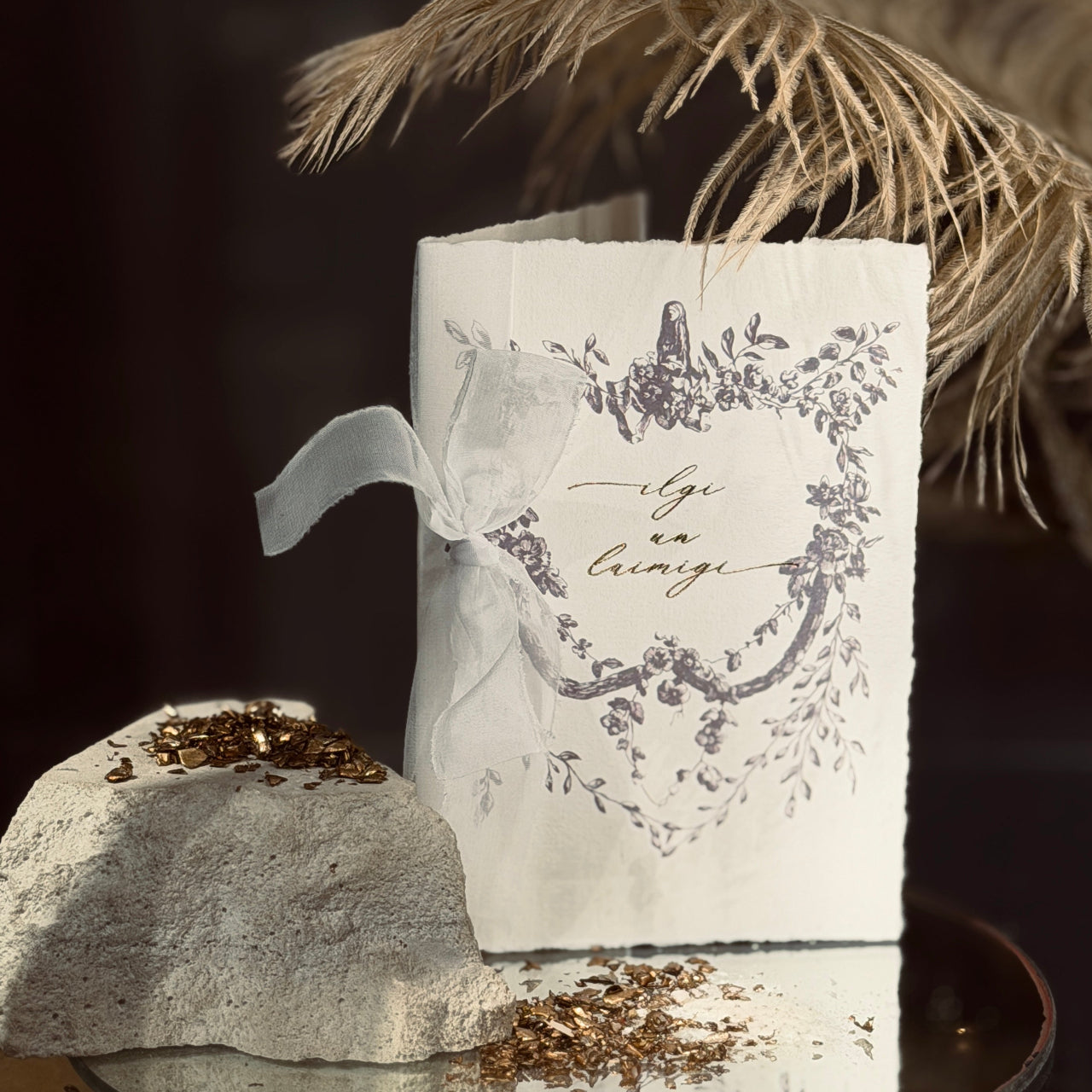 Maiga, romantiska un ar laika pieskārienu. Kartītei pievienota balta rokām plēsta lente, vēl svinīgākai un īpašākai noskaņai.