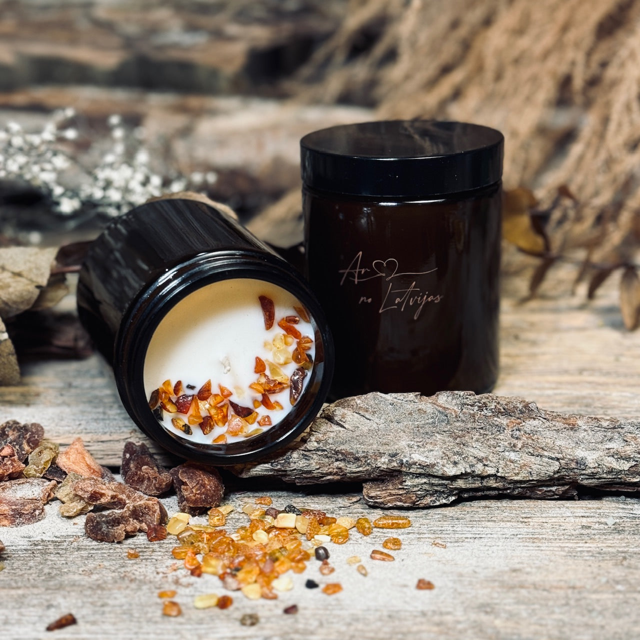 Ar MĪLESTĪBU no LATVIJAS, svece burciņā ar DZINTARU