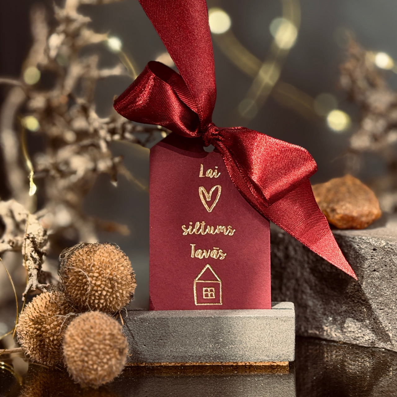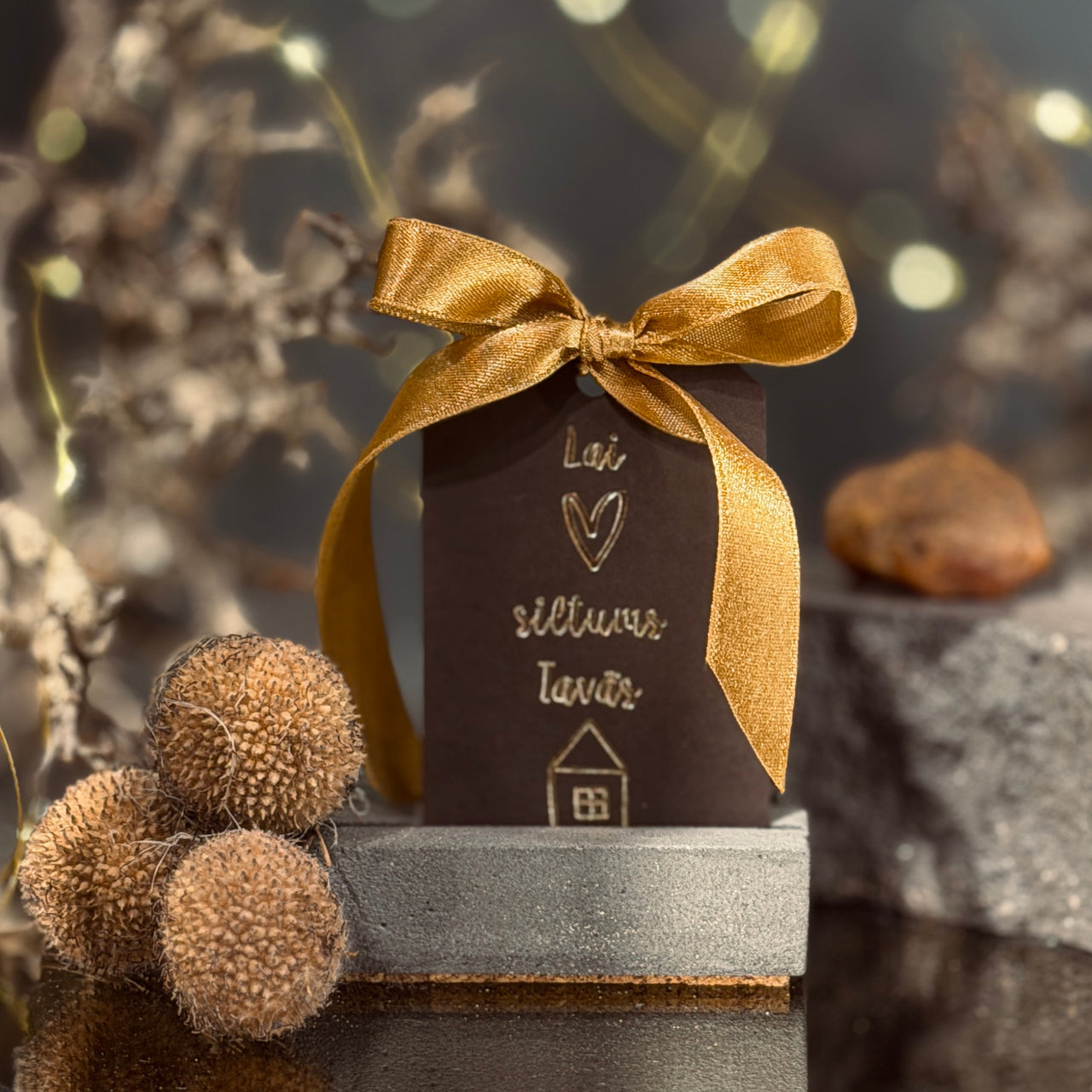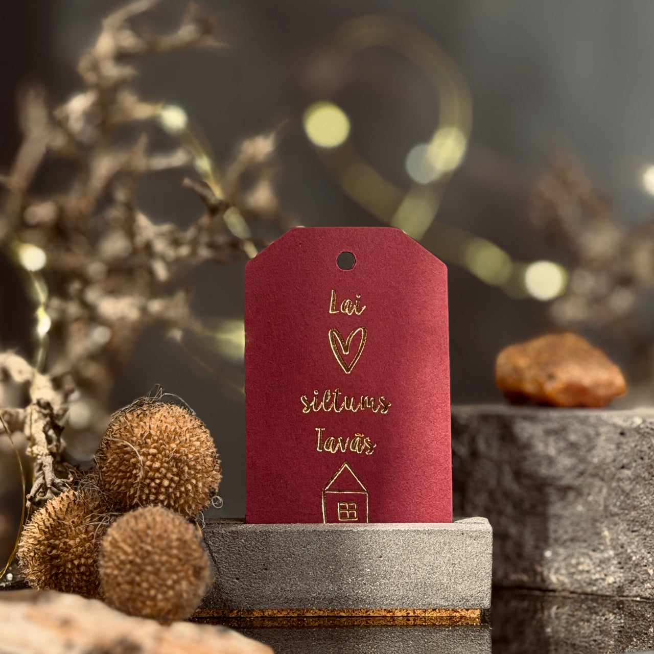 Mazas (8x5cm), gaumīgas dāvanu zīmītes ar zeltītu uzrakstu "Lai siltums Tavās mājās"... - mazs, ļoti nozīmīgs vēstījums, kas dāvanai piešķir dziļumu un īstu sajūtu. Šis novēlējums runā par mājīgumu, rūpēm un klātbūtni - par to, ko patiesībā vēlamies nodot, pasniedzot dāvanu.