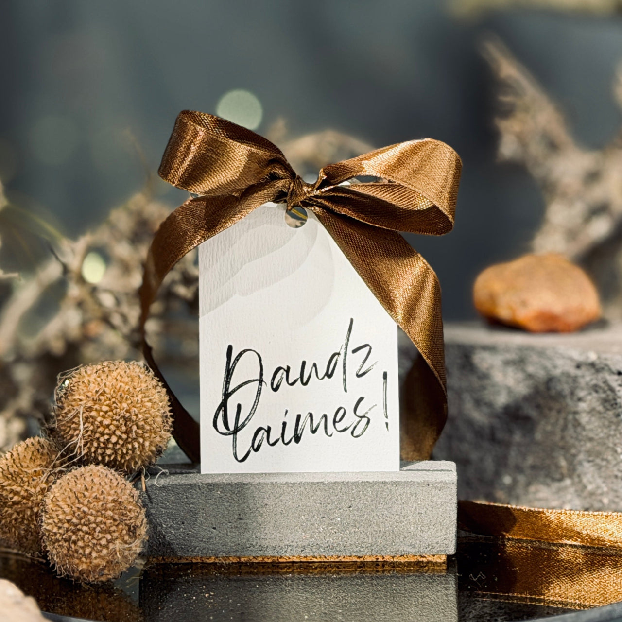 Dāvanu zīmītes drukātas uz kvalitatīva, bieza papīra ar maigu faktūru, kas labi sader ar dažādiem dāvanu iesaiņojumiem - gan svētku, gan ikdienas. Neitrālais dizains, ļauj tās izmantot dažādos dzīves notikumos un vecuma grupām.