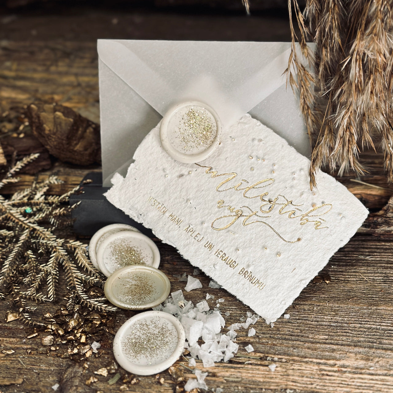 Apsveikuma kartīte ir dabīgi baltā krāsā, uzraksts "mīlestībā augt" pieejams zelta/sudraba tonī. Malas raupji plēstas.