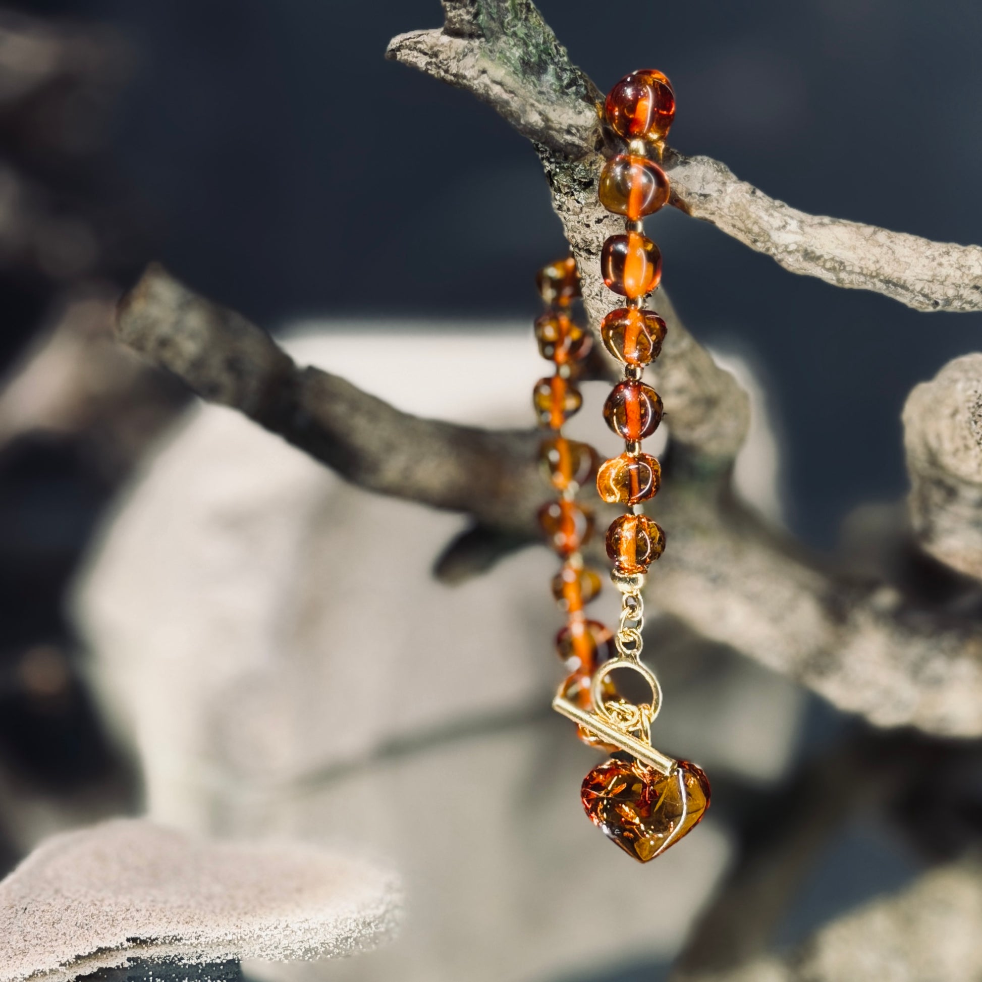 Neregulāras dzintara pērlītes atklāj akmens dabisko skaistumu - no gaiši medainiem līdz dziļai konjaka tonim. Sirds kulons piešķir rotai simbolisku nozīmi - mīlestību, sirsnību un klusus spēku. T-veida aizdare ir ērta un droša, vienlaikus kļūstot par elegantu dizaina elementu.