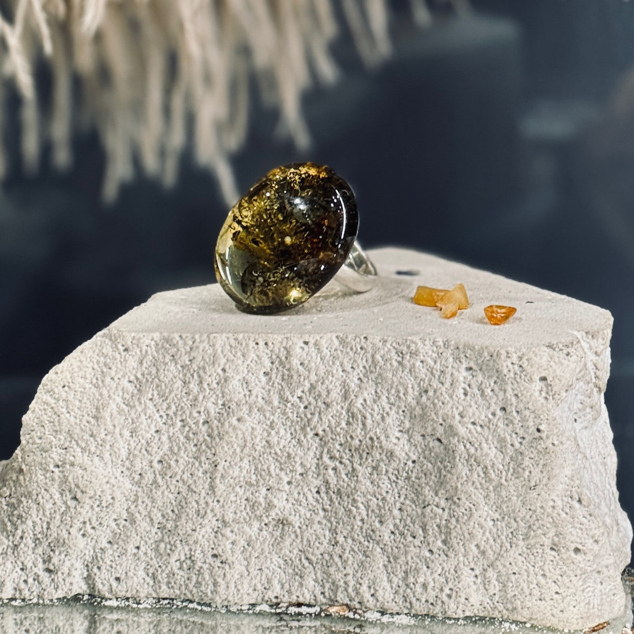 Dzintara gredzeniem 18 izmērs, dzintara gredzeniem iespējams pastiept  lielāku pašu sudraba gredzenu.