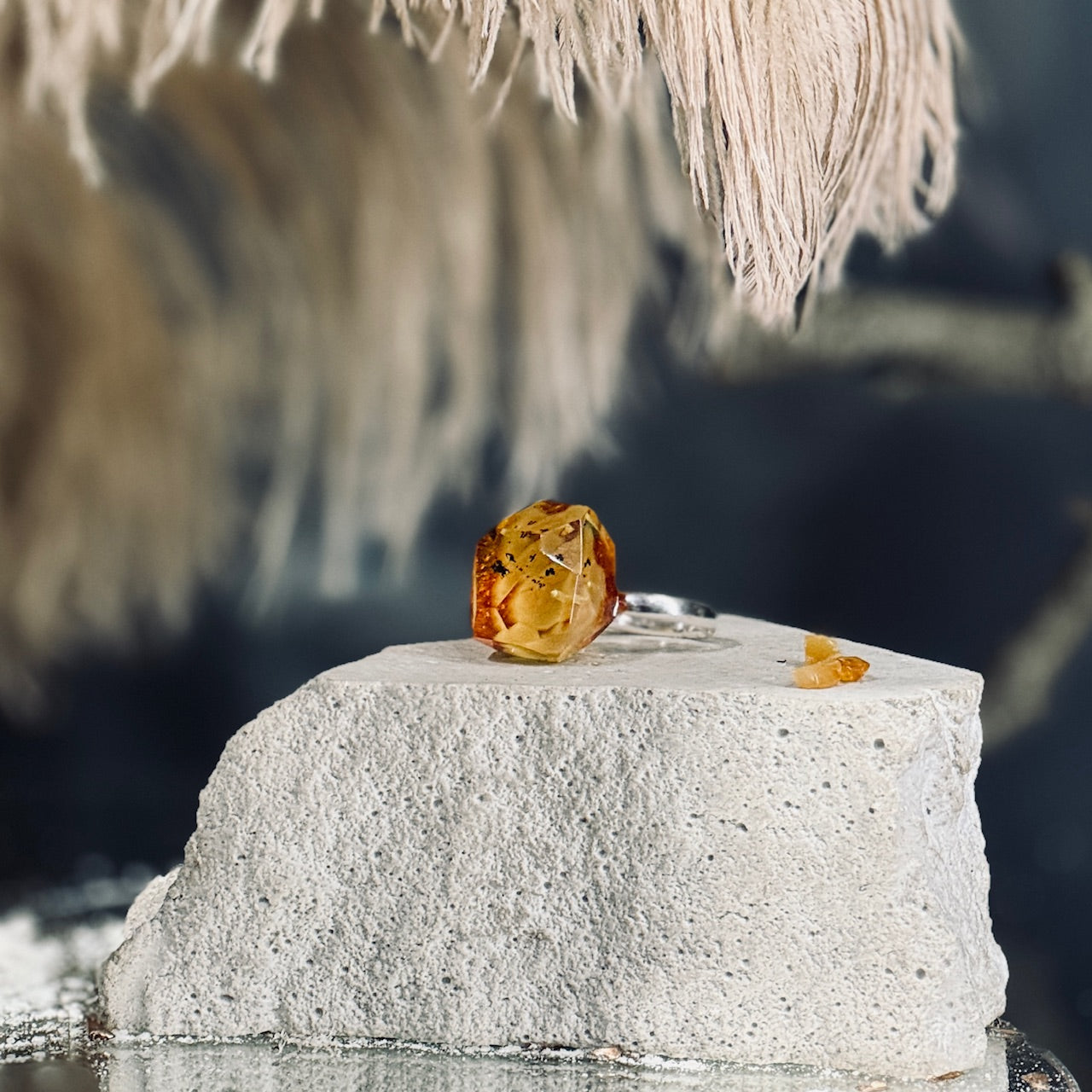 Dzintara gredzeniem 18 izmērs, dzintara gredzeniem iespējams pastiept lielāku pašu sudraba gredzenu.