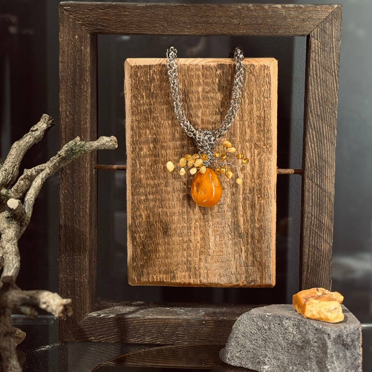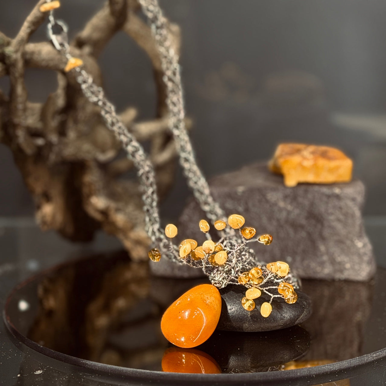 Dzintars nerūsējošā tērauda adījumā.
