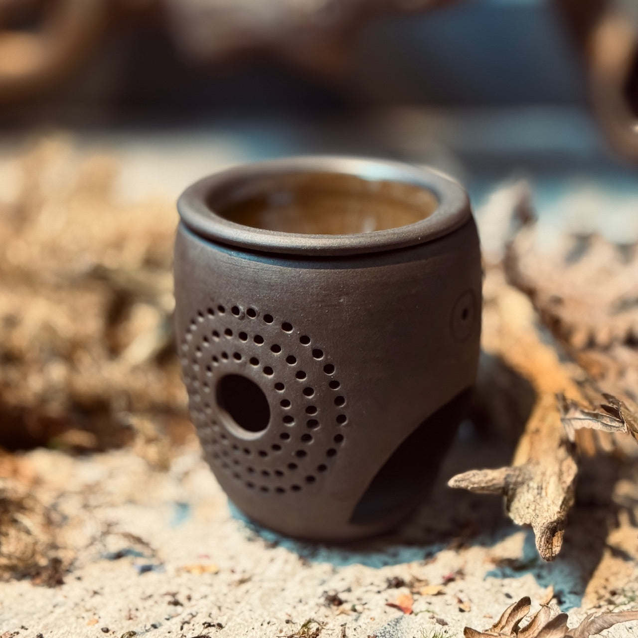 Aromlampas veidotas ar rokām uz podnieka ripas no gaišās akmens masas. Apdedzināšanas temperatūra – 1050°C. .