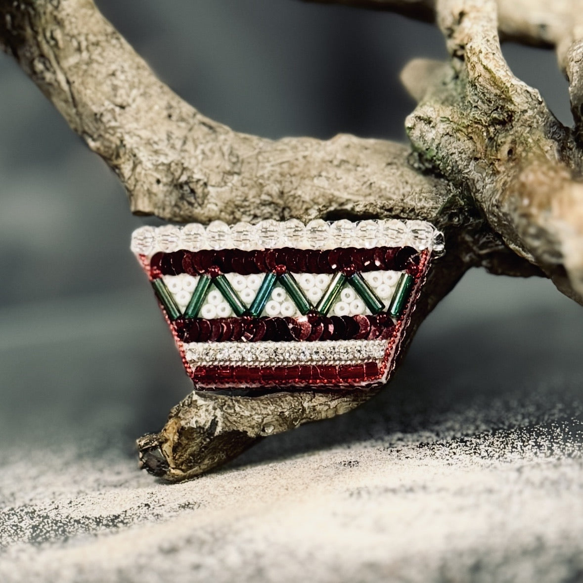Brošas sarkanā, baltā krāsu gamma, kā arī izšūtie raksti ataino senču mākslas izjūtu.