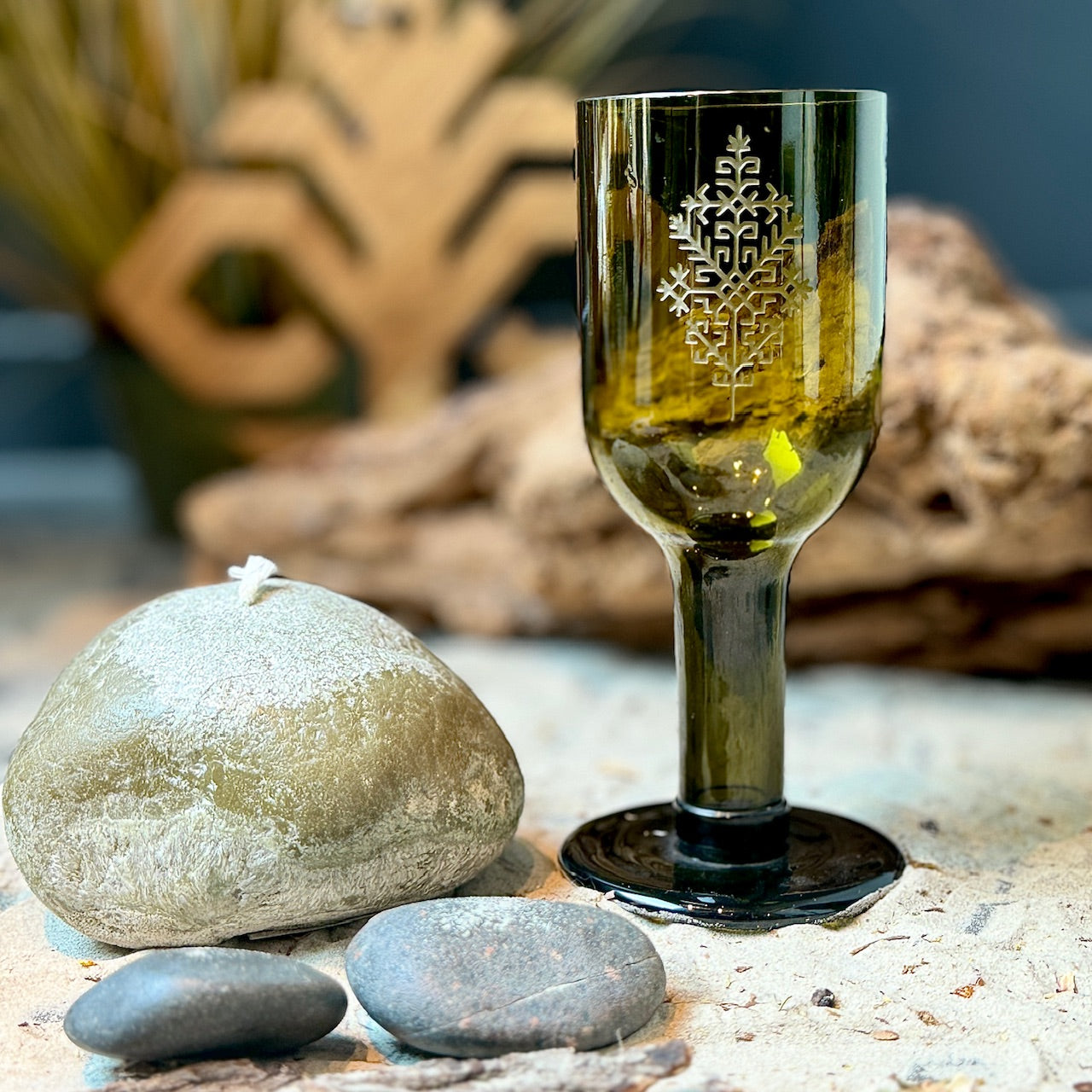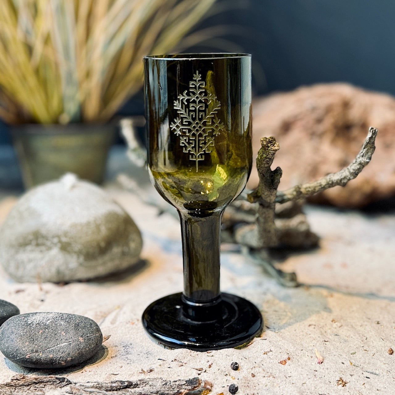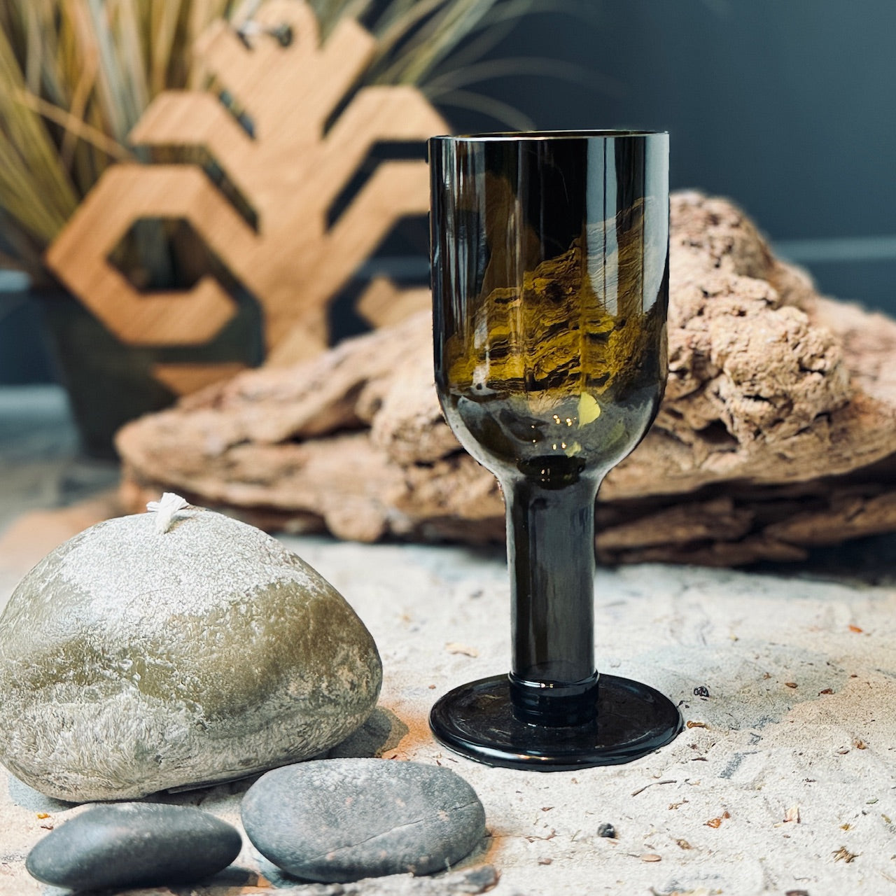 Autentiskas glāzes, kas dzīvo savu otro dzīvi, jo veidotas no izlietotām alus un vīna pudelēm.