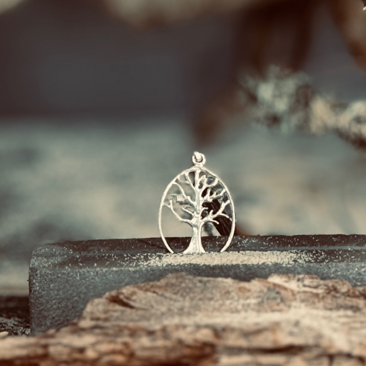 Smalki izstrādāts sudraba kulons ar Dzīvības koka siluetu - vienu no spēcīgākajiem pasaules simboliem, kas sastopams arī latviešu tautasdziesmās un senajās zīmēs. Koks, kura saknes balsta zemi, stumbrs - cilvēku paaudzes, un zari sniedzas debesīs - gara gaismā.