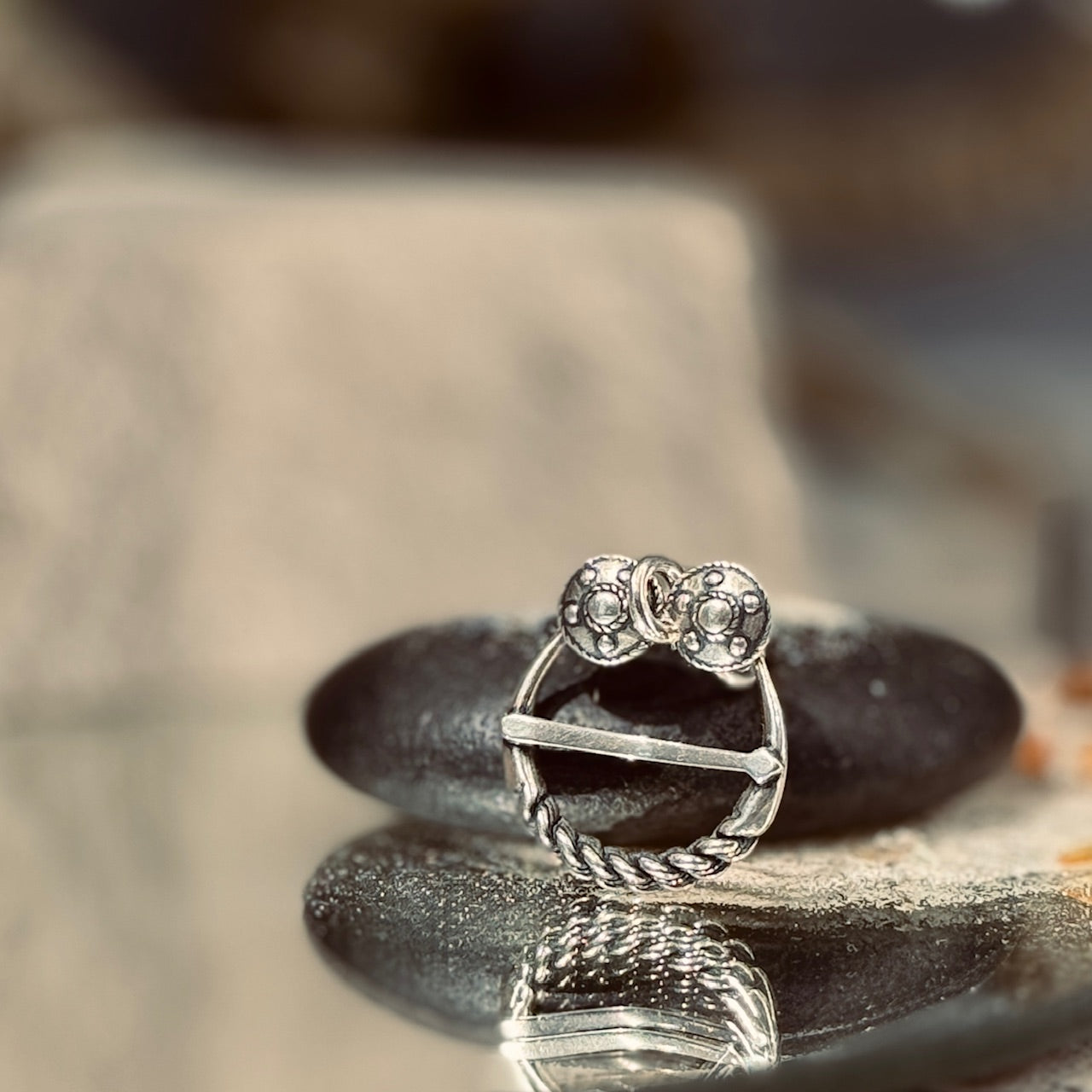 Pakavsaktas forma sargā no ļauna, tā simbolizē noslēgtu loku - drošību un dzimtas spēku. Nameja pinums savukārt ir zīmīgs cieši savijies raksts, kas stāsta par tautas vienotību un indivīda piederību savām saknēm. Abu zīmju apvienojums rotā šo rotaslietu, padarot to par spēcīgu amuletu un personīgu vērtību.