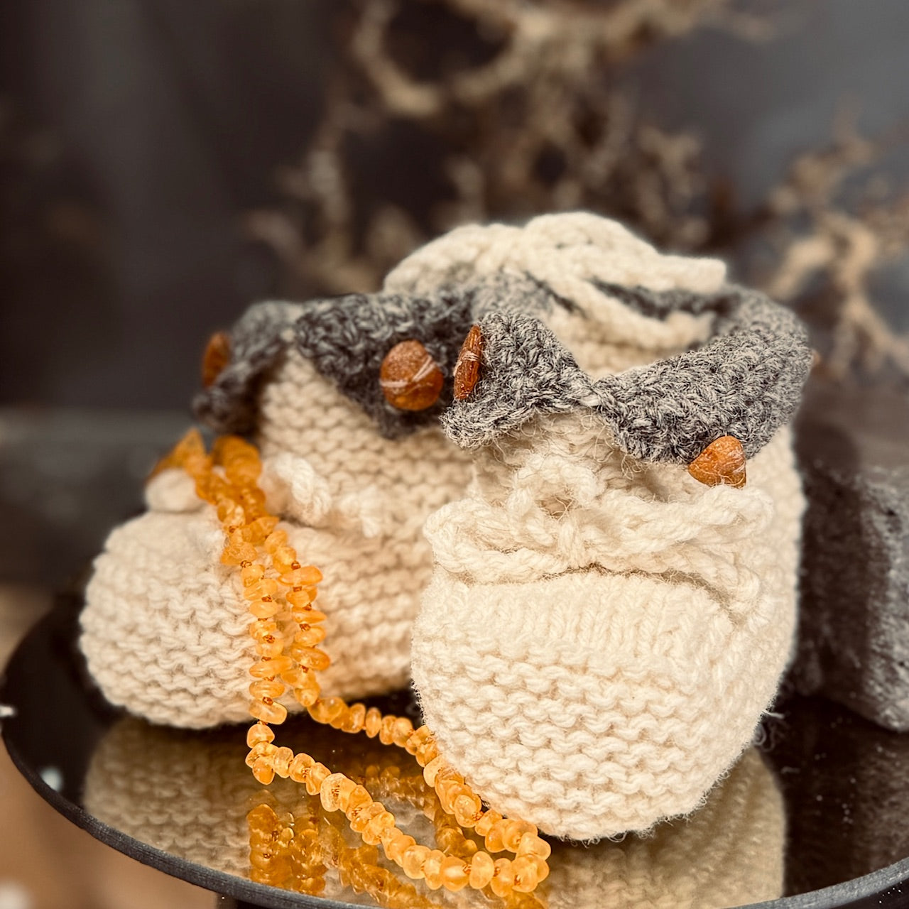 Roku darinātie zīdaiņu zābaciņi no dabīgas vilnas, sargā mazuļa kājiņas, nodrošinot siltumu un elpojamību. Tos rotā īstas dzintara pērlītes - senlatviešu sargzīme, saules spēka simbols.