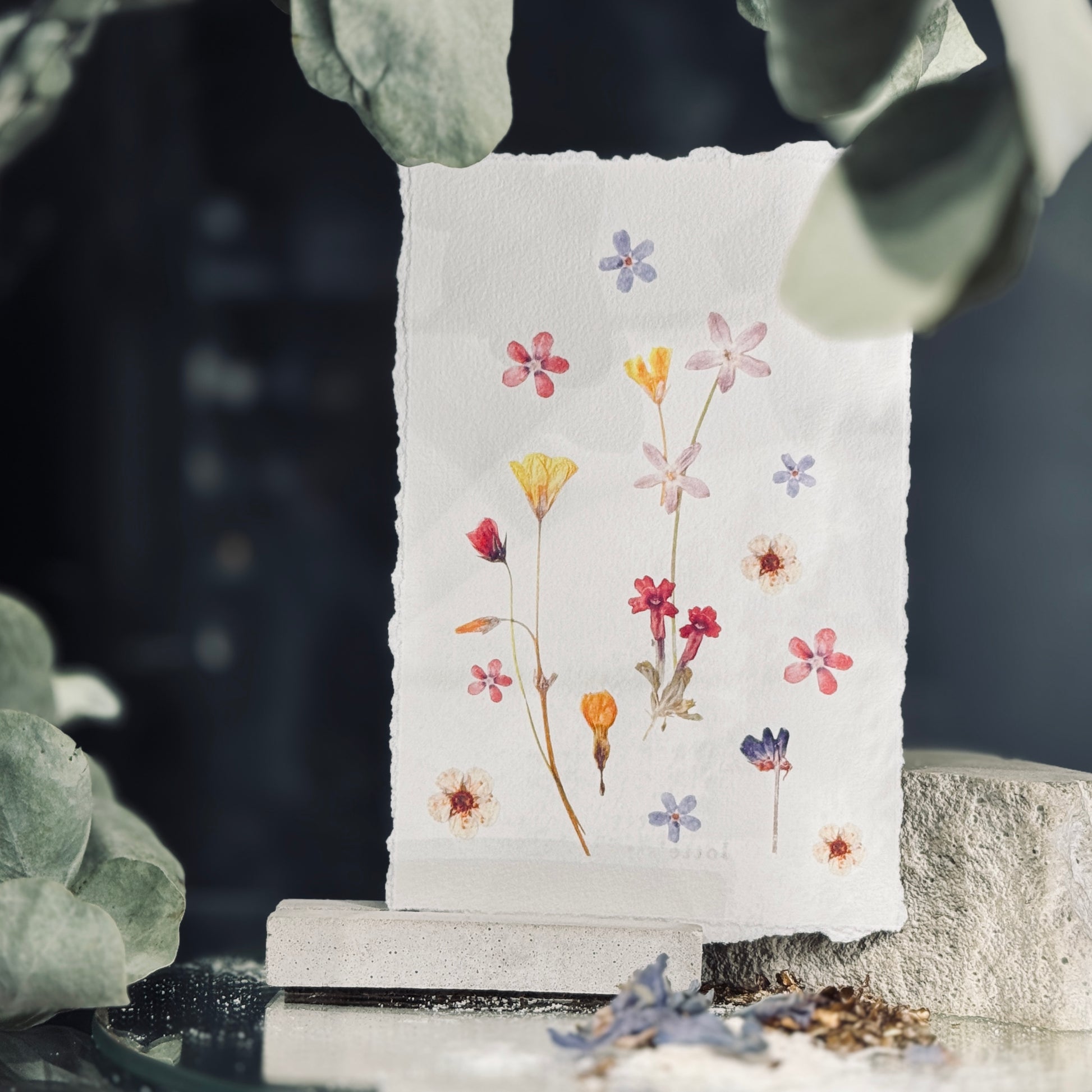 Smalkas un vieglas apsveikuma kartītes, radītas ar rokām plēsta akvareļu papīra, kas kateau kartītei piešķlir unikālu ralsturu, un dabisku eleganci. Ziedu motīvi - maigi, gaisīgi un niansēti, ļaujot krāsām brīvi saplūst ar papīra faktūru.