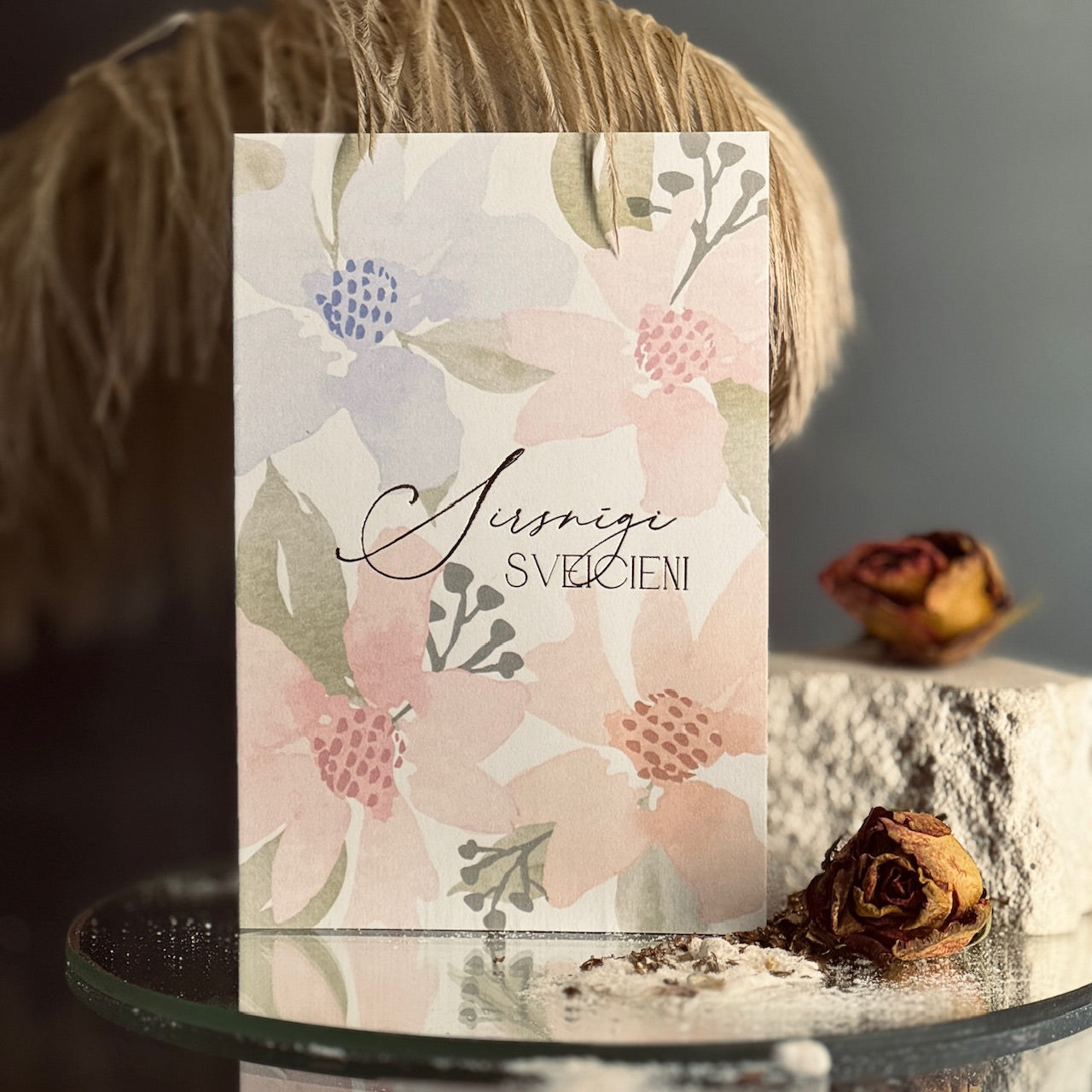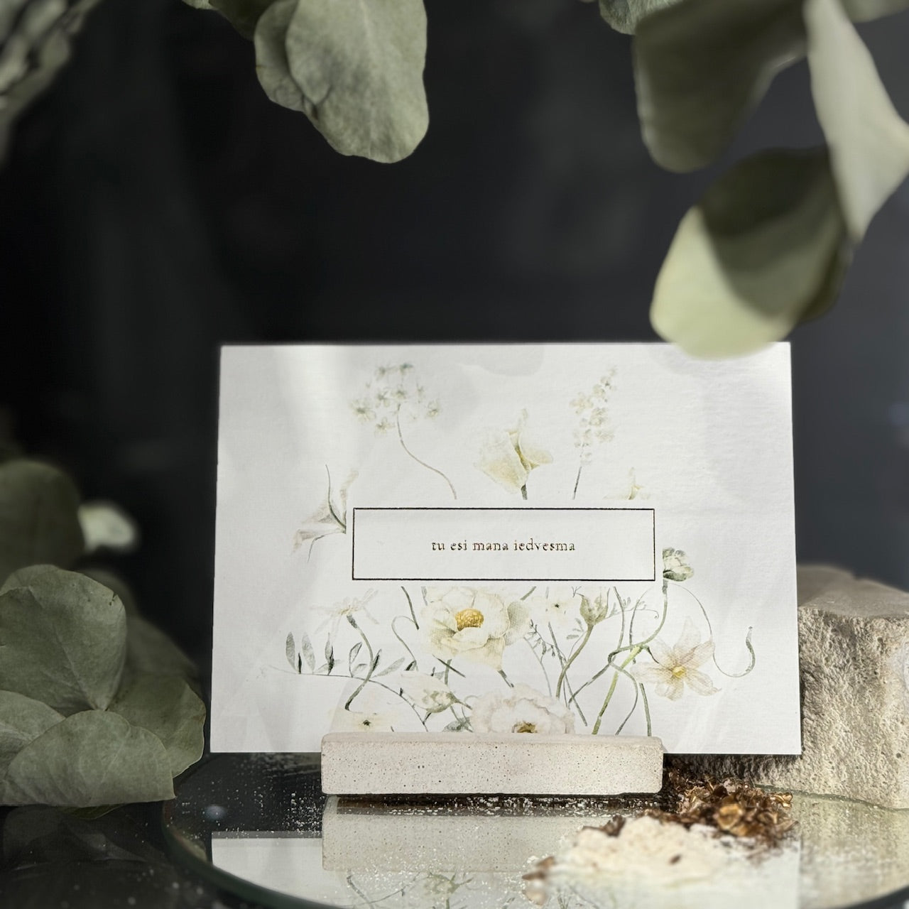 - Atveramas apsveikuma kartītes ar ilustrāciju un tekstu iespiestu zelta reljefspiedē. Iekšpuse ir tukša, lai vari ierakstīt savu vēlējumu.