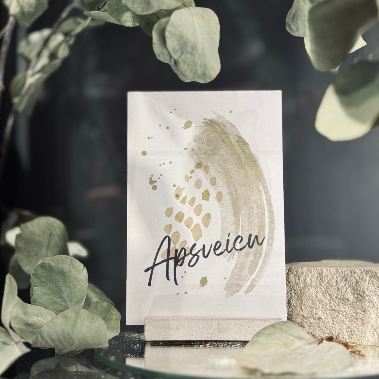 - Vienpusējas apsveikuma kartītes ar ilustrāciju un iespiestu tekstu zelta reljefspiedē. Otra kartītes puse ir tukša, lai vari uzrakstīt savu vēlējumu.