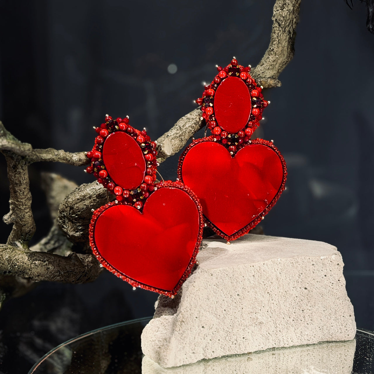Auskari, kas piesaista skatienu un neatstāj vienaldzīgu. Intensīvi sarkanā krāsa, bagātīgā forma un izteiksmīgais dizains rada svinīgu, kaislīgu noskaņu.