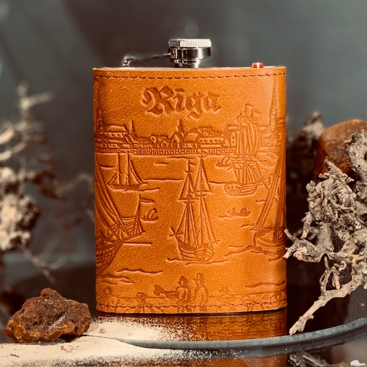 Stilīga un izturīga blašķe, kas apvilkta ar dabīgas ādas apdari, kurā iespiests vēsturiskais Rīgas skats ar burukuģiem un senatnīgu pils panorāmu.