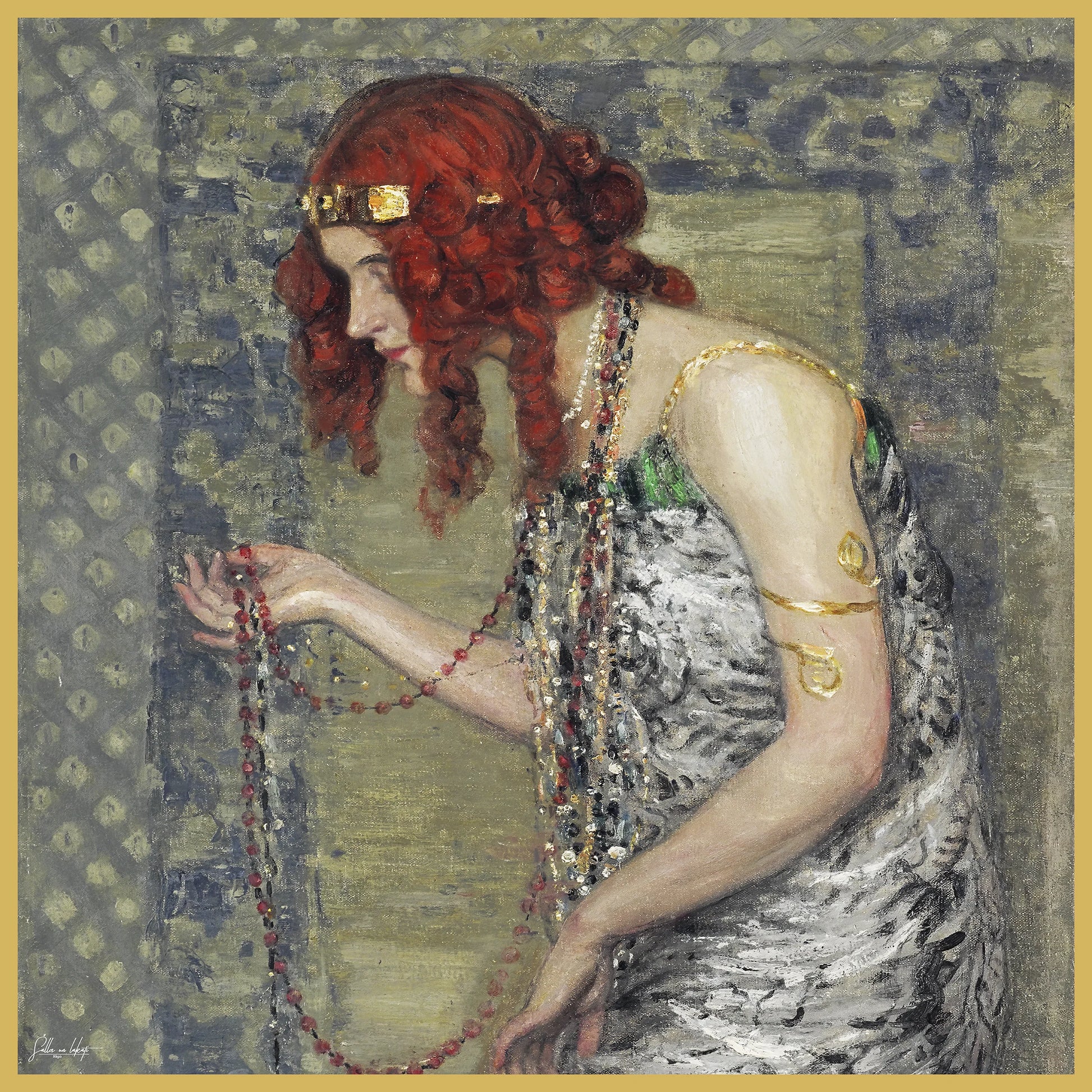 - Zīda lakata gleznā redzama dāma ar sarkaniem matiem - noslēpumaina, aristokrātiska, gandrīz mitoloģiska būtne, kas simbolizē skaistumu, vilinājumu, grēku, kārdinājumu.