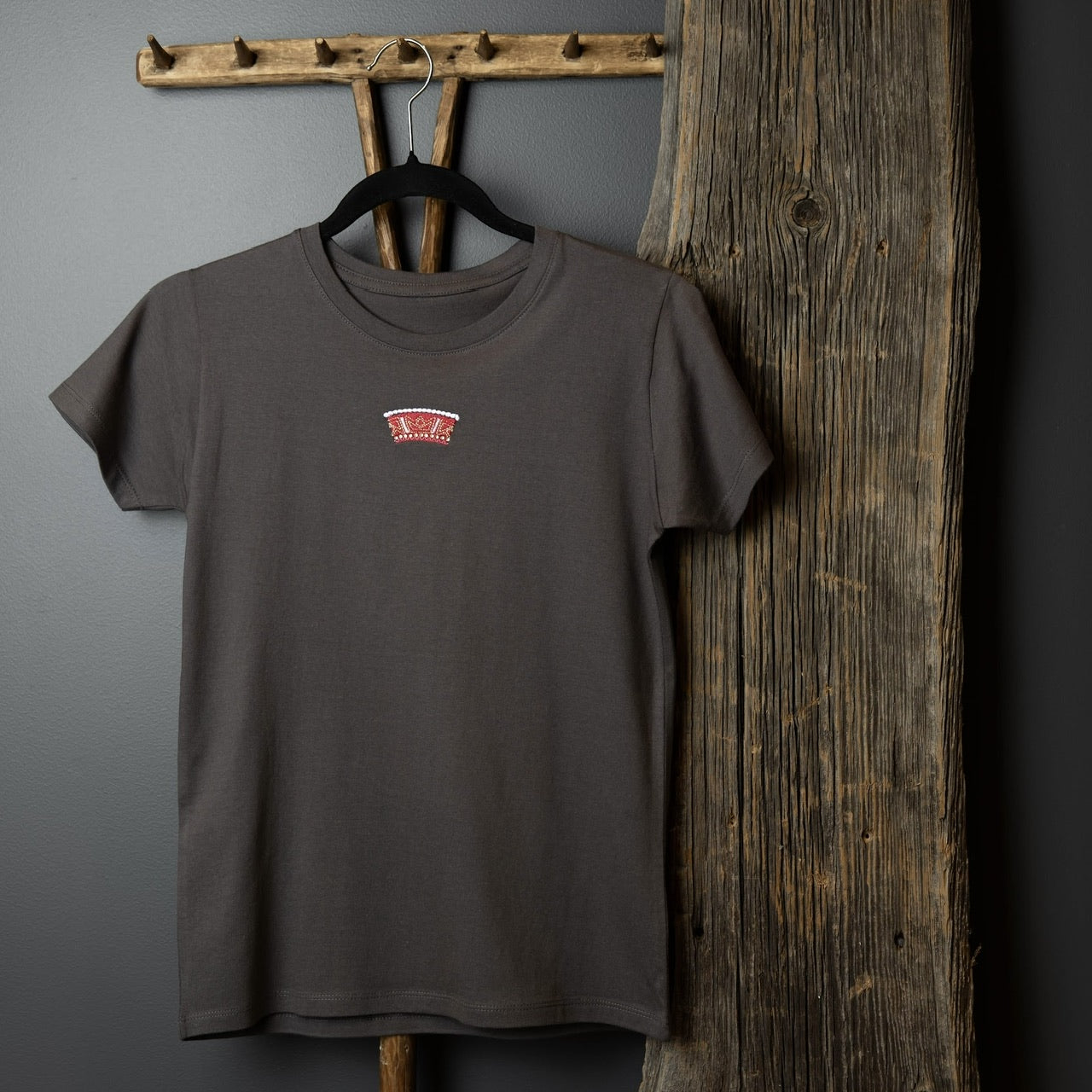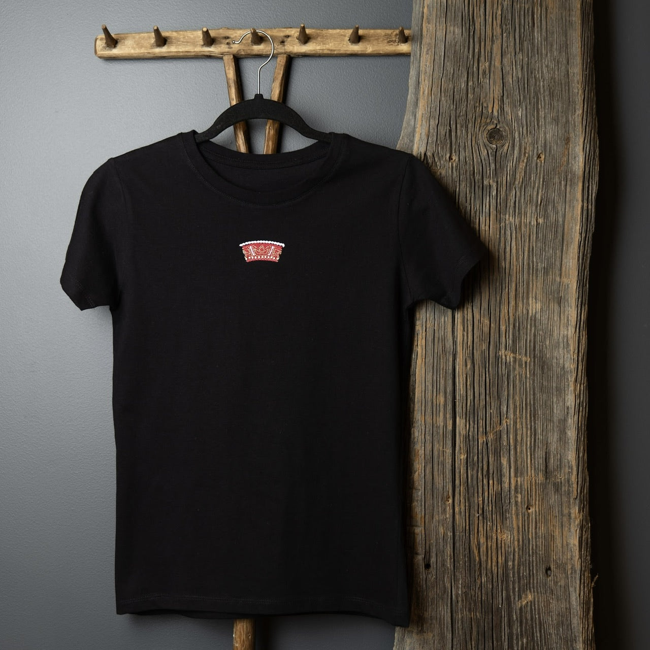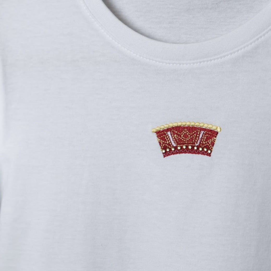 Spēcīgs simbols no Kurzemes tautumeitu pūra - Bārtas vainags, šodien pārtapis smalkā izšuvumā uz mūsdienīga T-krekla. Koši sarkanā krāsa ar balto pērļu un zelta akcentiem atgādina par bagātajām tradīcijām un lepno tautas rotu, kas vienmēr bijusi sievietes goda un cieņas apliecinājums.