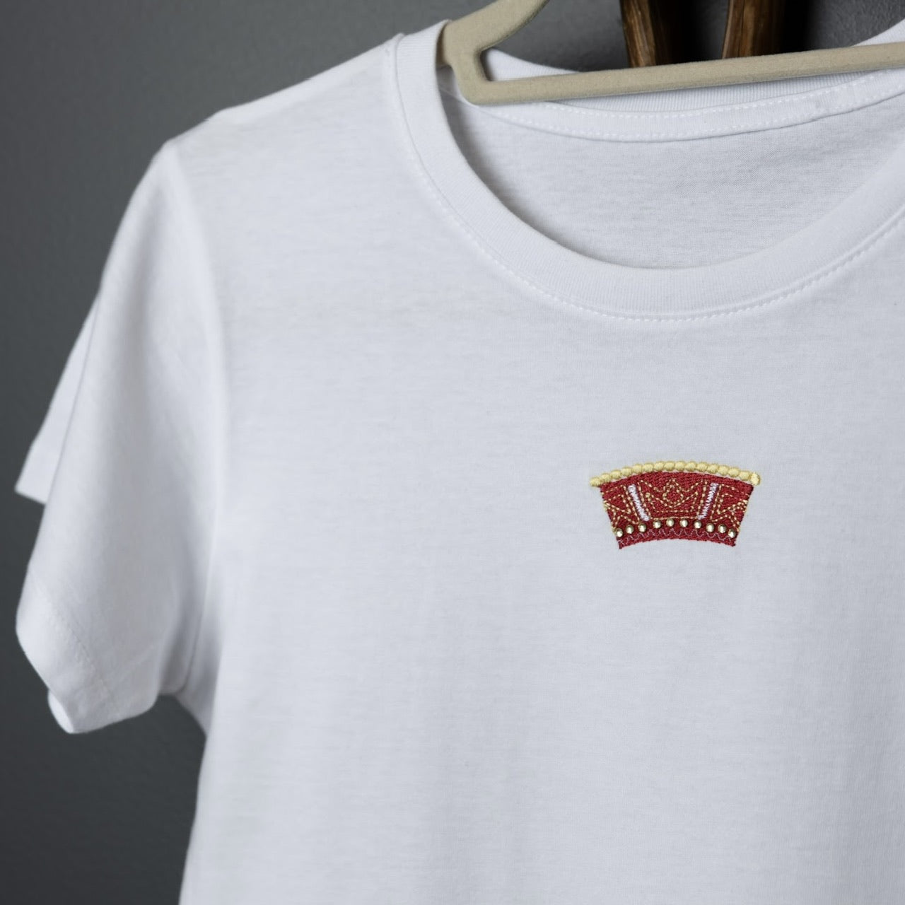 Spēcīgs simbols no Kurzemes tautumeitu pūra - Bārtas vainags, šodien pārtapis smalkā izšuvumā uz mūsdienīga T-krekla. Koši sarkanā krāsa ar balto pērļu un zelta akcentiem atgādina par bagātajām tradīcijām un lepno tautas rotu, kas vienmēr bijusi sievietes goda un cieņas apliecinājums.