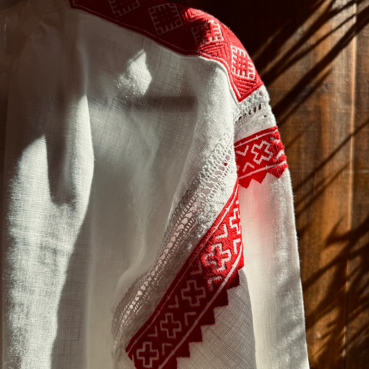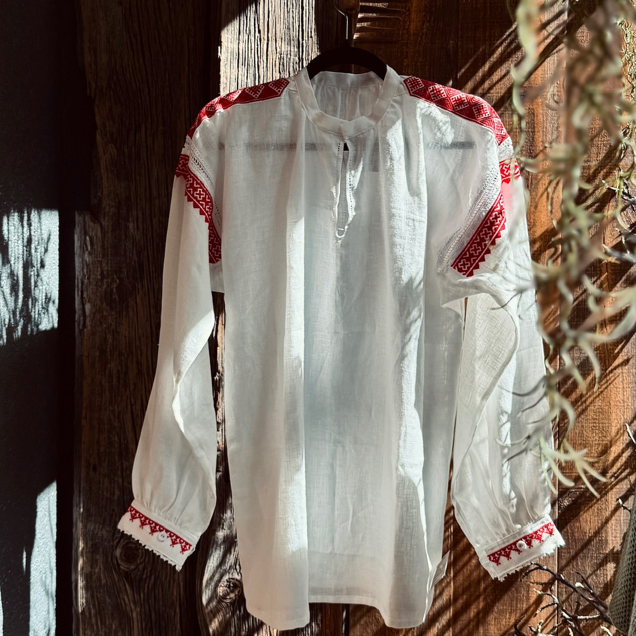 Krekls ir darināts no lina auduma, saglabājot autentiskumu un senču amata prasmes. Smalks roku darbs un vēsturiskā precizitāte padara šo kreklu par izcilu izvēli svētku reizēm, tautas deju kolektīviem un tradīciju cienītājiem.