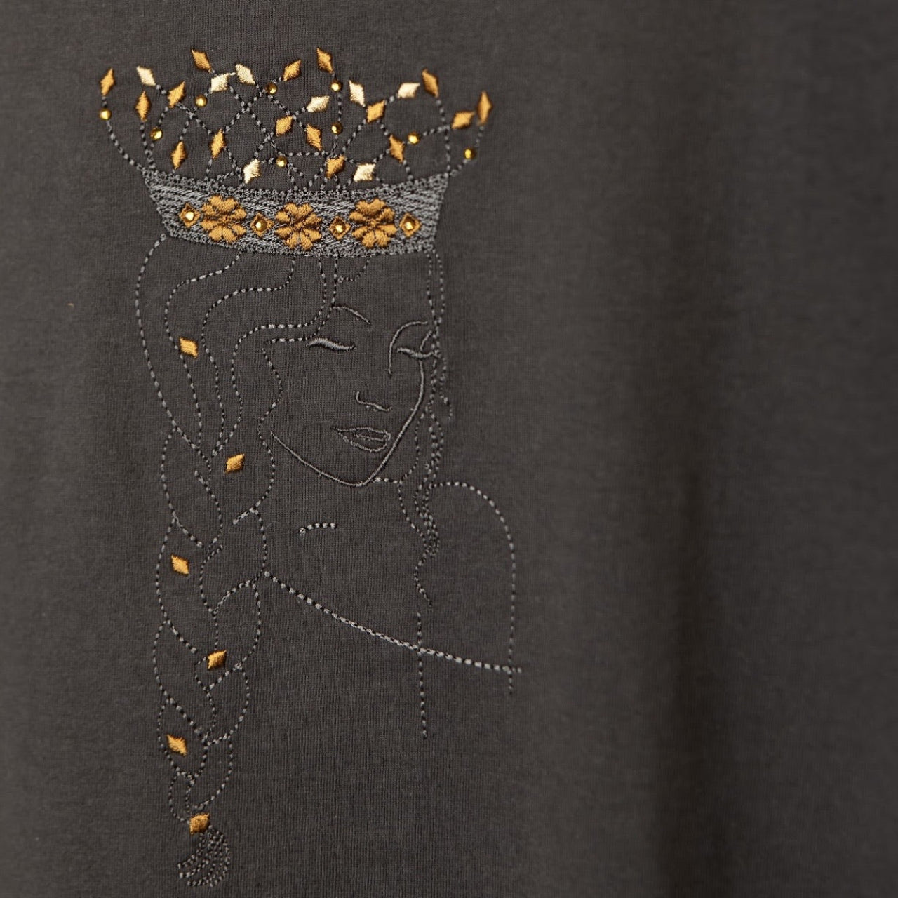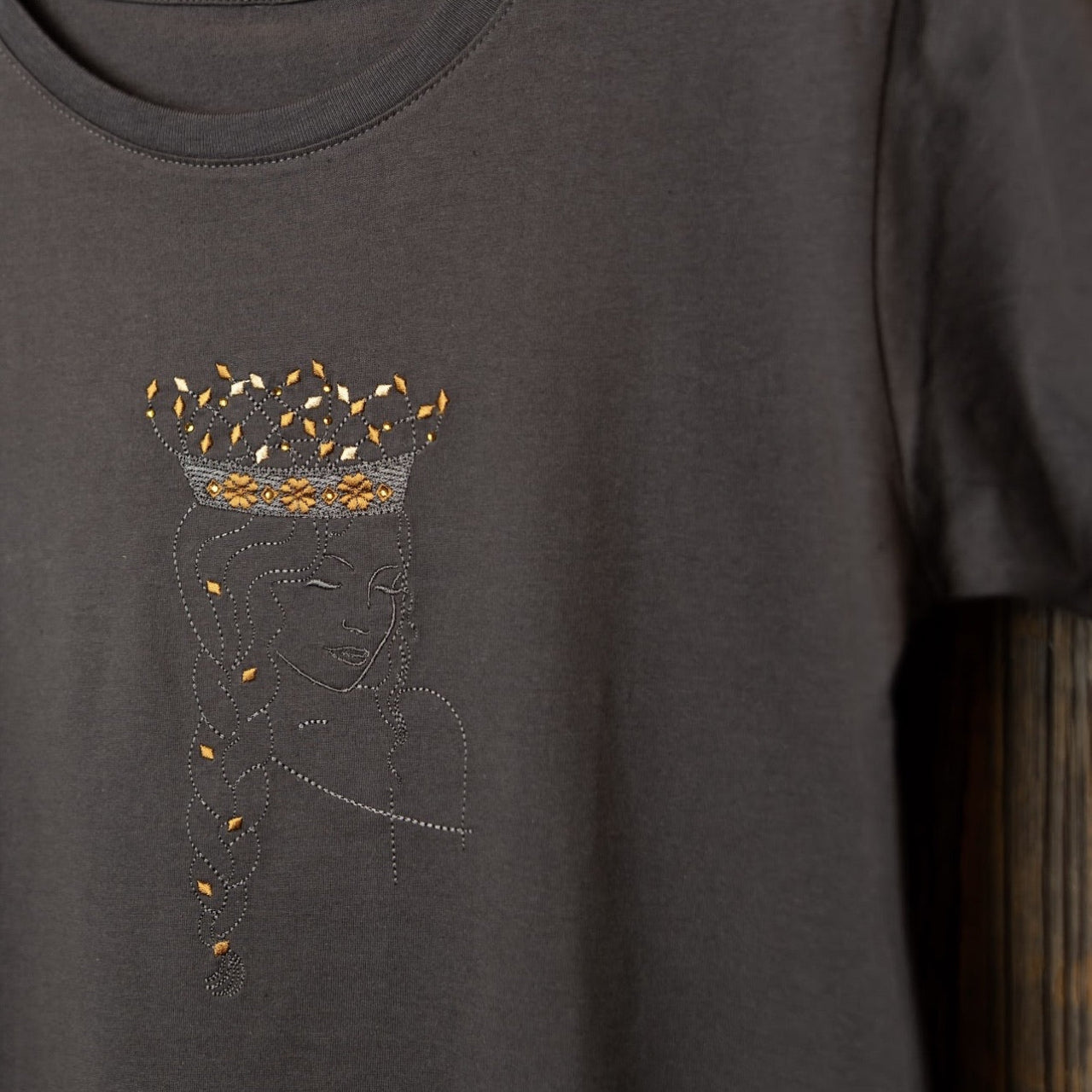 Kokvilnas t-krekls būs ērts ikdienai, taču izteiksmīgais izšuvums piešķir tam īpašu raksturu. Tas ir apģērbs, kas ļauj justies brīvi un vienlaikus grezni - kā karalienei ik dienas.