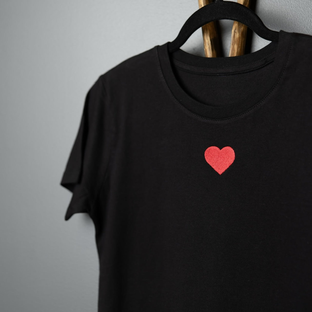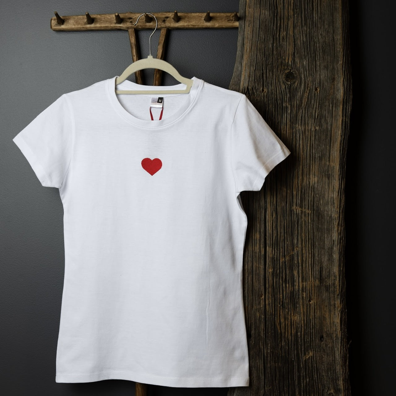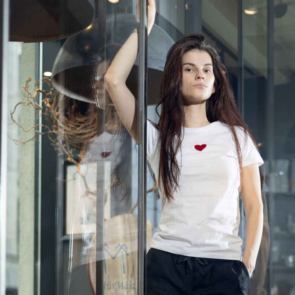 Klasiska piegriezuma sieviešu T–krekls ar apaļu kakla izgriezumu. Mīksts, elpojošs un ērts 100% kokvilnas T-krekls ar izšūtu sirsniņu - maigs akcents, kas runā sirds valodā. Katrs krekls ir rūpīgi veidots ar izšuvumu dažādās krāsās, ļaujot Tev izvēlēties to toni, kas vislabāk atspoguļo Tavu noskaņu vai attieksmi
