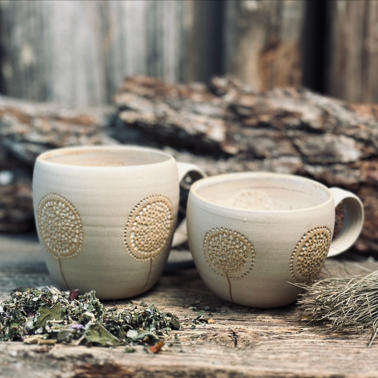 Krūzes Baltais zieds veidots ar rokām uz podnieka ripas no baltās akmens masas. Apdedzināšanas temperatūra – 1250°C. Izmantotā glazūra ir videi un cilvēka veselībai draudzīga bez kaitīgiem piemaisījumiem.