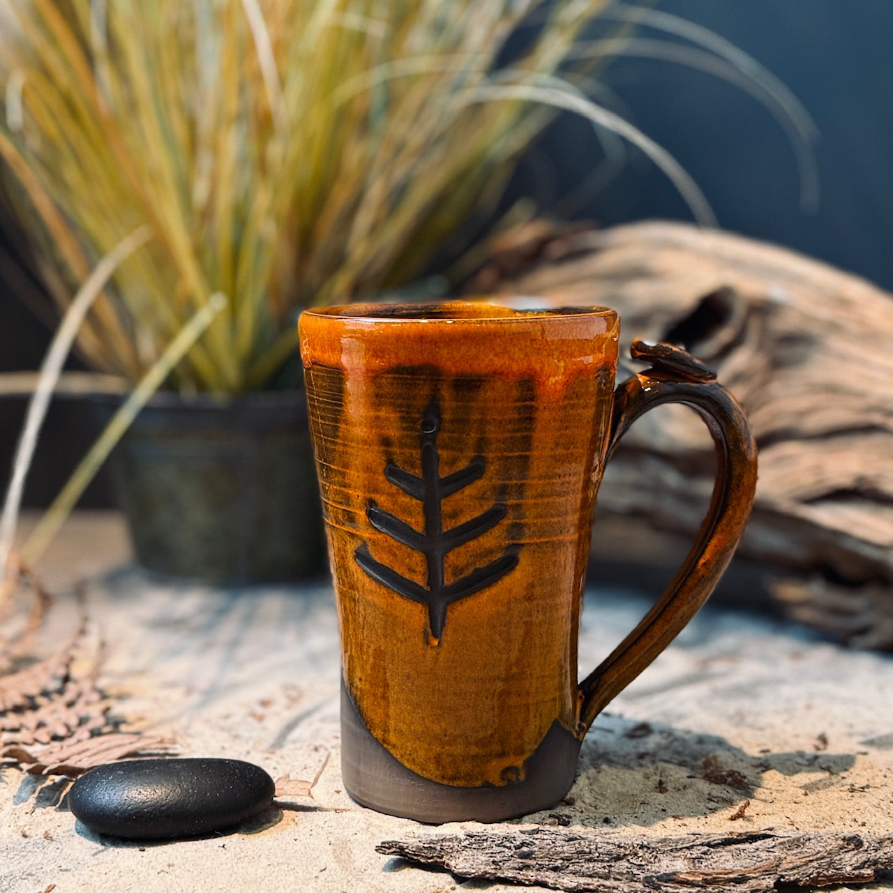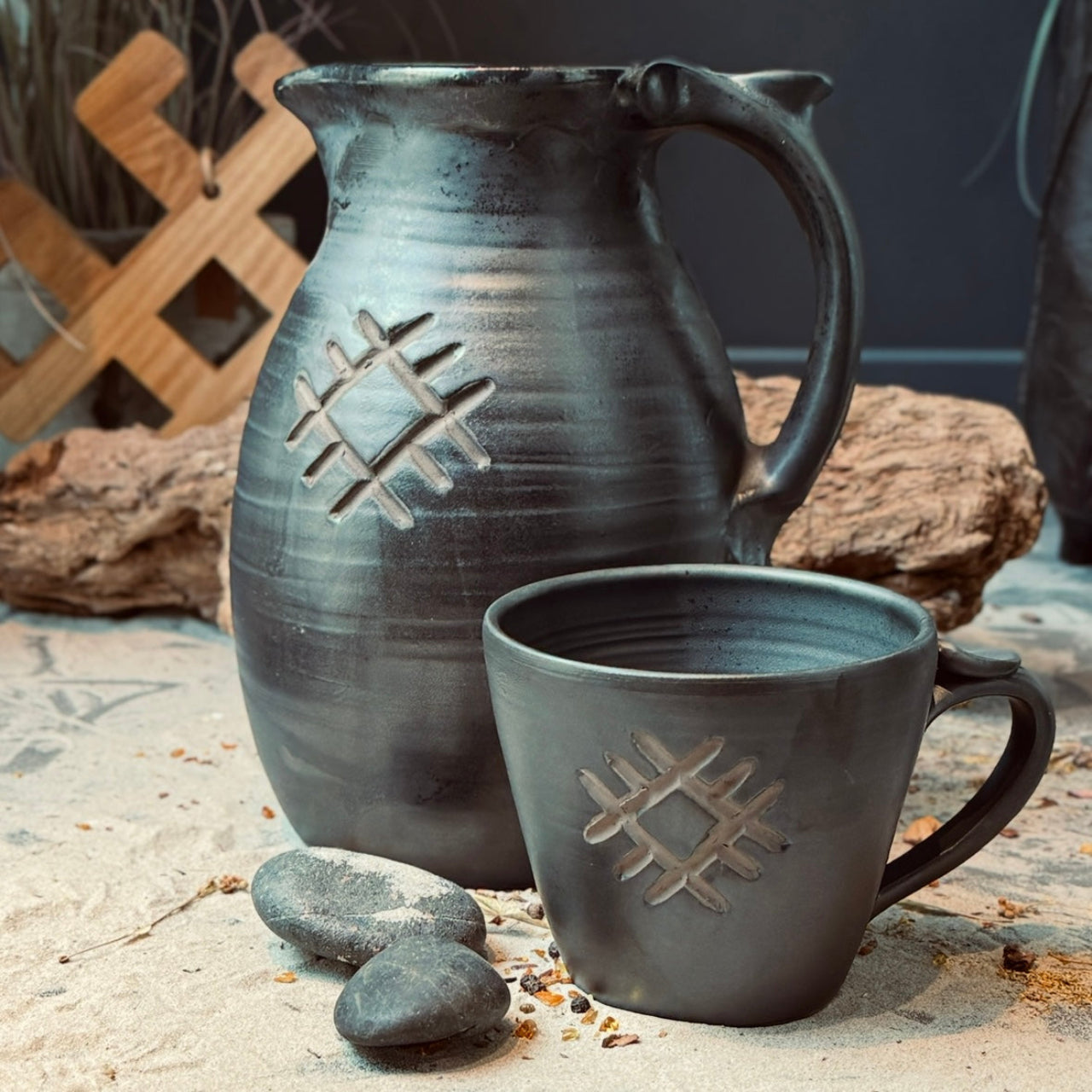 Keramikas krūzes ar latviešu spēka zīmēm ir virpotas uz podnieka ripas. Darbi ir veidoti no brūnā māla, glazētas ar melno metālisko glazūru. Krūzes ir 2 reizes apdedzinātas.