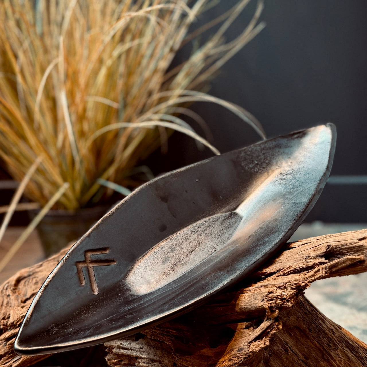 Keramikas servējamie trauki laivas ar latviešu spēka zīmēm ir veidoti no brūnā māla, glazētas ar melno metālisko glazūru. Trauki ir 2 reizes apdedzinātas.