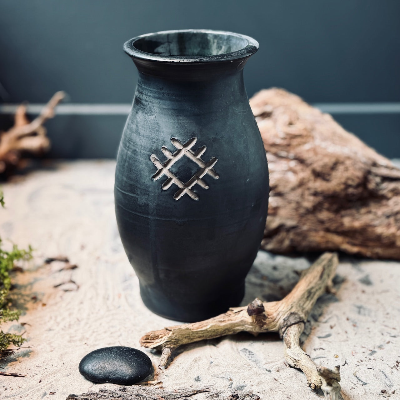 Latviešu spēka zīmes uz ziedu vāzēm ir kā ceļš starp mūsu tautas, autora identitāti un lietotāju, kas trauka prakstiskajam pielietojumam piešķir arī astrālas aizsardzības nozīmi.