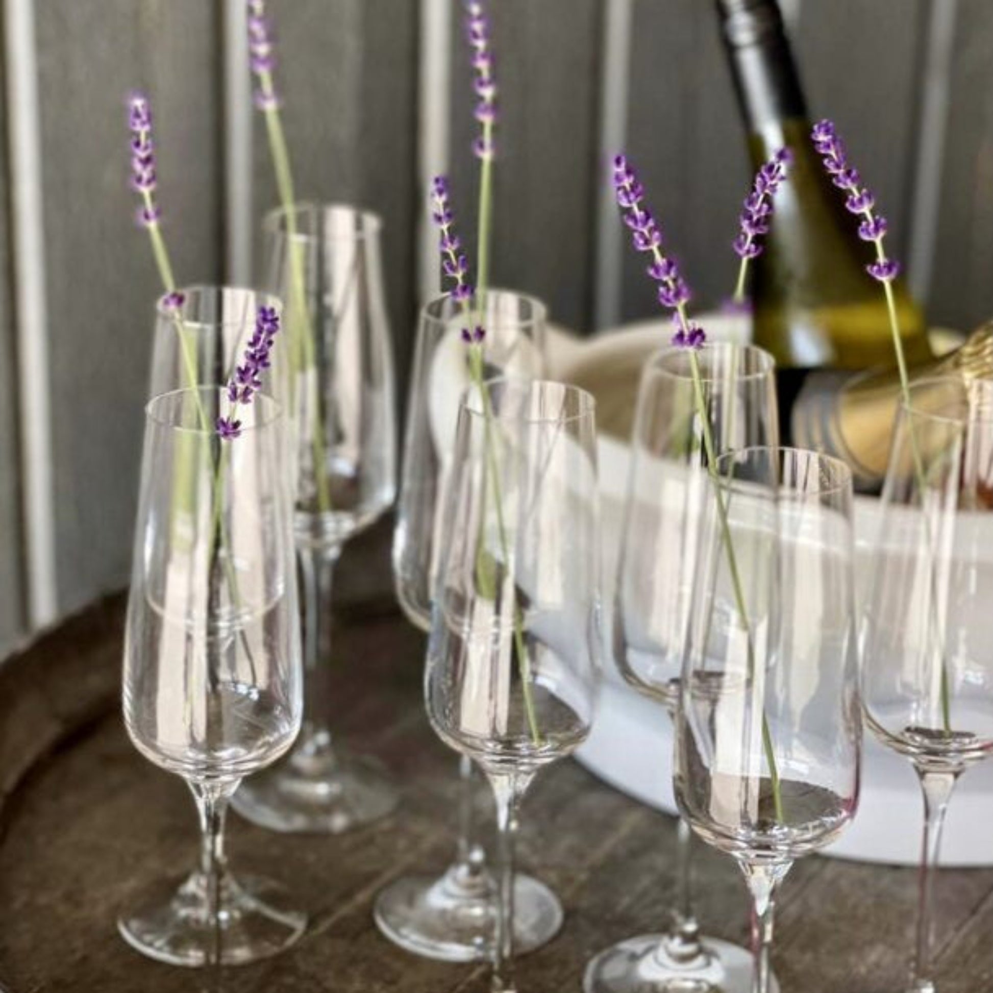 Šampanieša glāzē lej lavandu sīrupu, pievieno citrona sulu un pārlej ar prosecco.