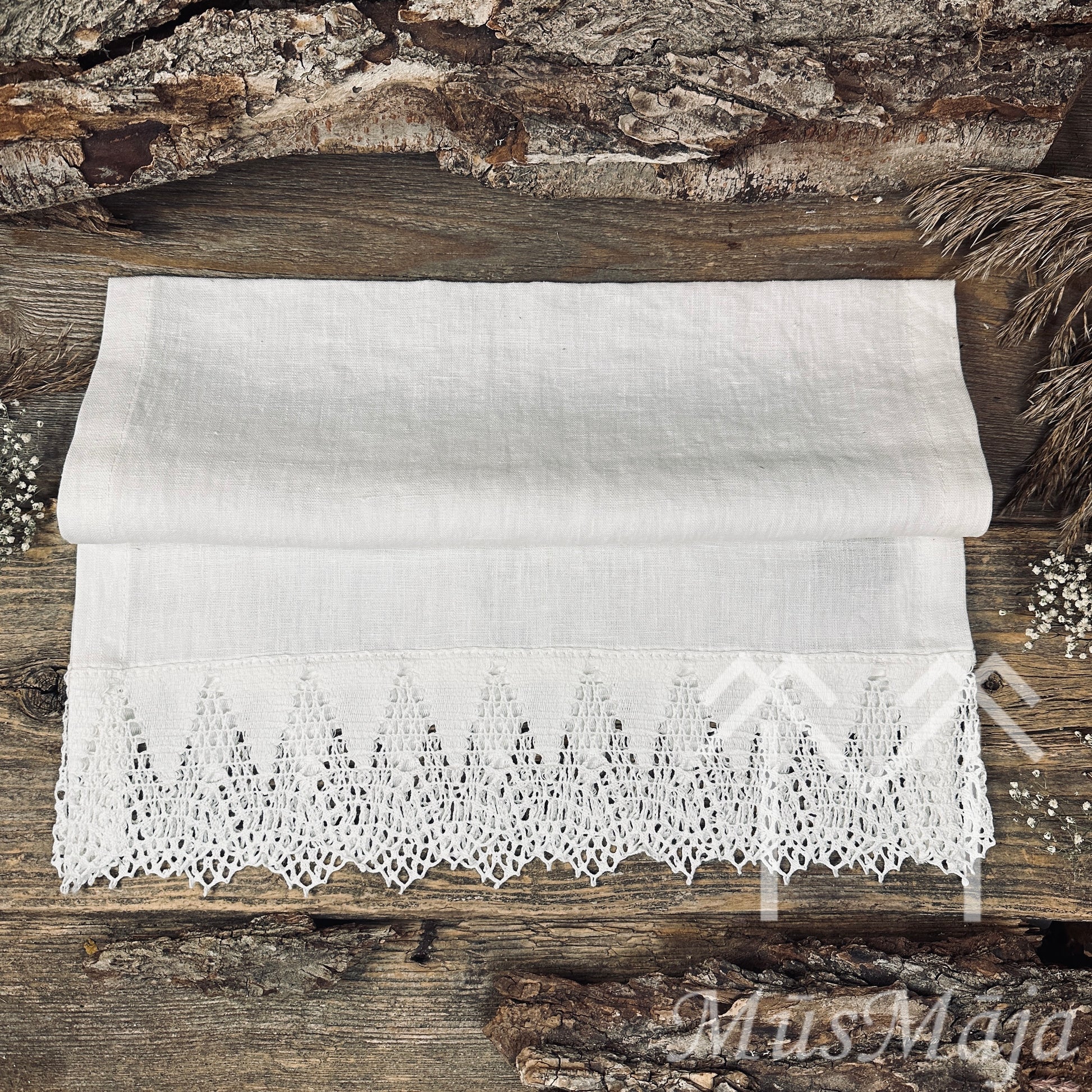 Galda celiņa galos grezna lina mežģīne.