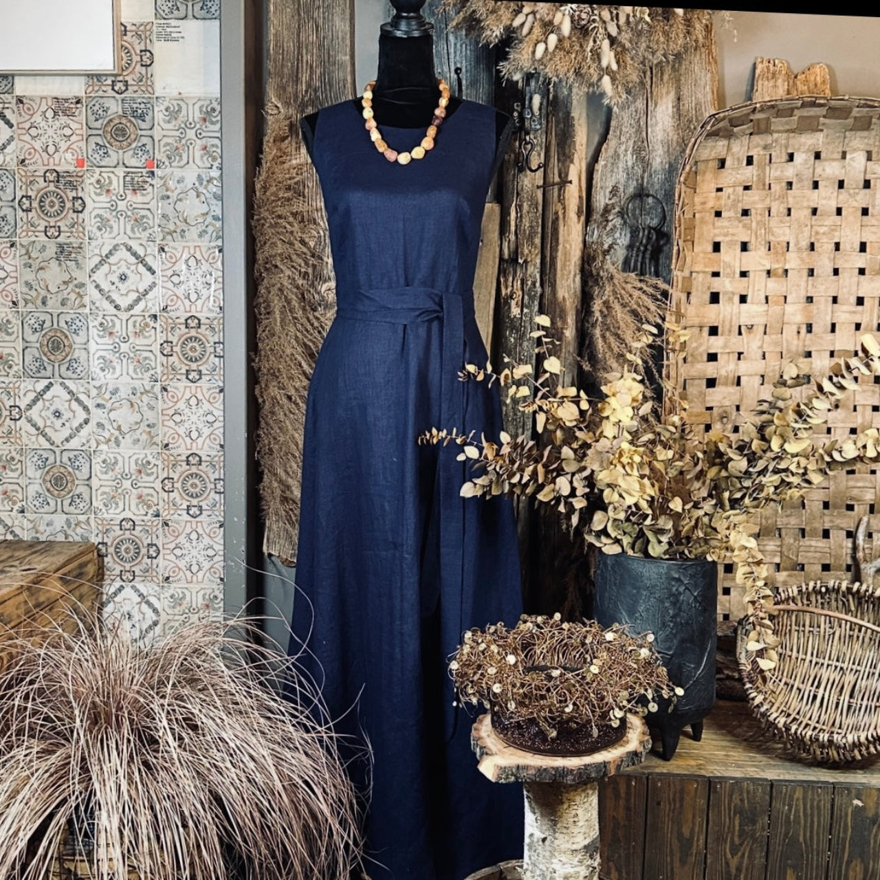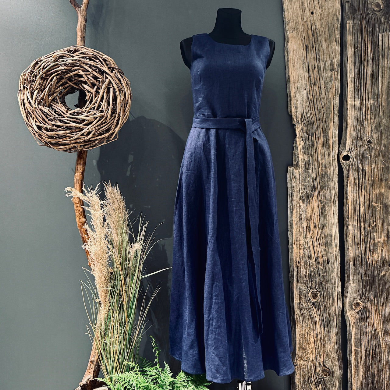 Eleganta un vienlaikus vienkārša - šī garā lina kleita ir radīta sievietei, kura novērtē dabiskumu, brīvību un klusinātu skaistumu. Taisns griezums, viegli regulējama jostiņa un dabisks kritums piešķir lina kleitai harmonisku siluetu, kas piestāv gan ikdienai, gan svinīgiem brīžiem.