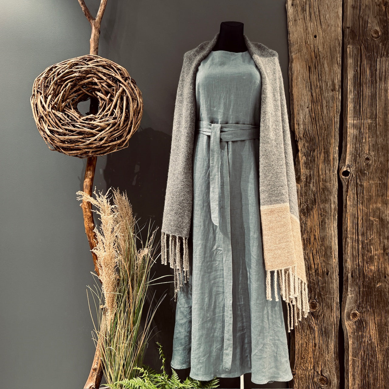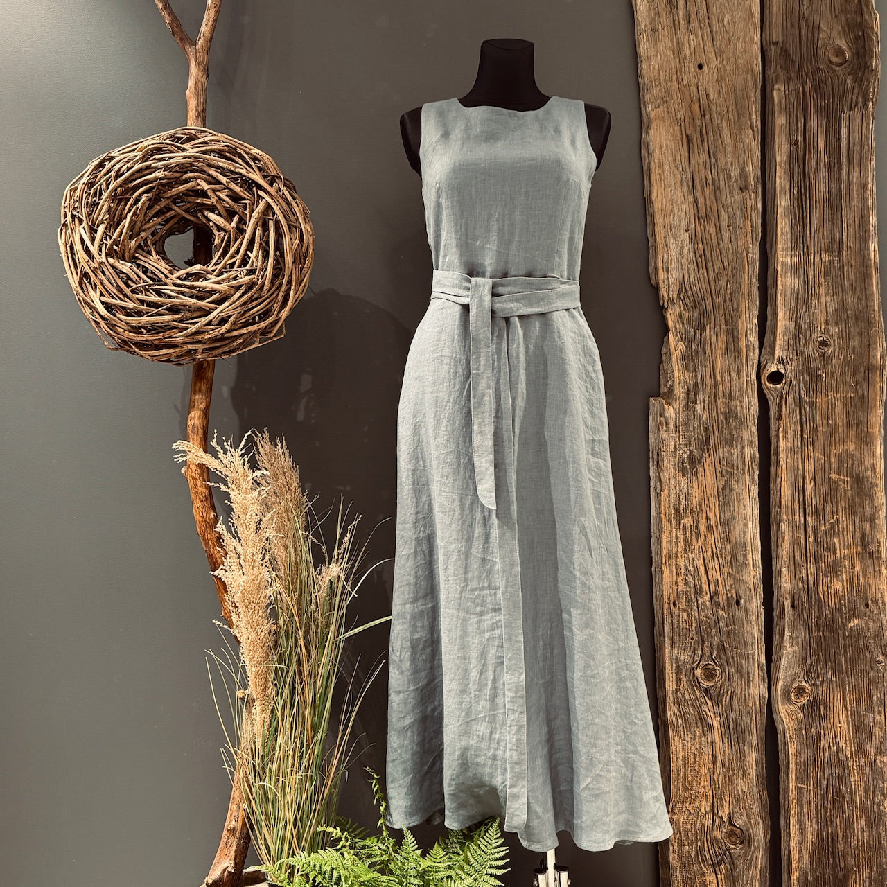Eleganta un vienlaikus vienkārša - šī garā lina kleita ir radīta sievietei, kura novērtē dabiskumu, brīvību un klusinātu skaistumu. Taisns griezums, viegli regulējama jostiņa un dabisks kritums piešķir lina kleitai harmonisku siluetu, kas piestāv gan ikdienai, gan svinīgiem brīžiem.