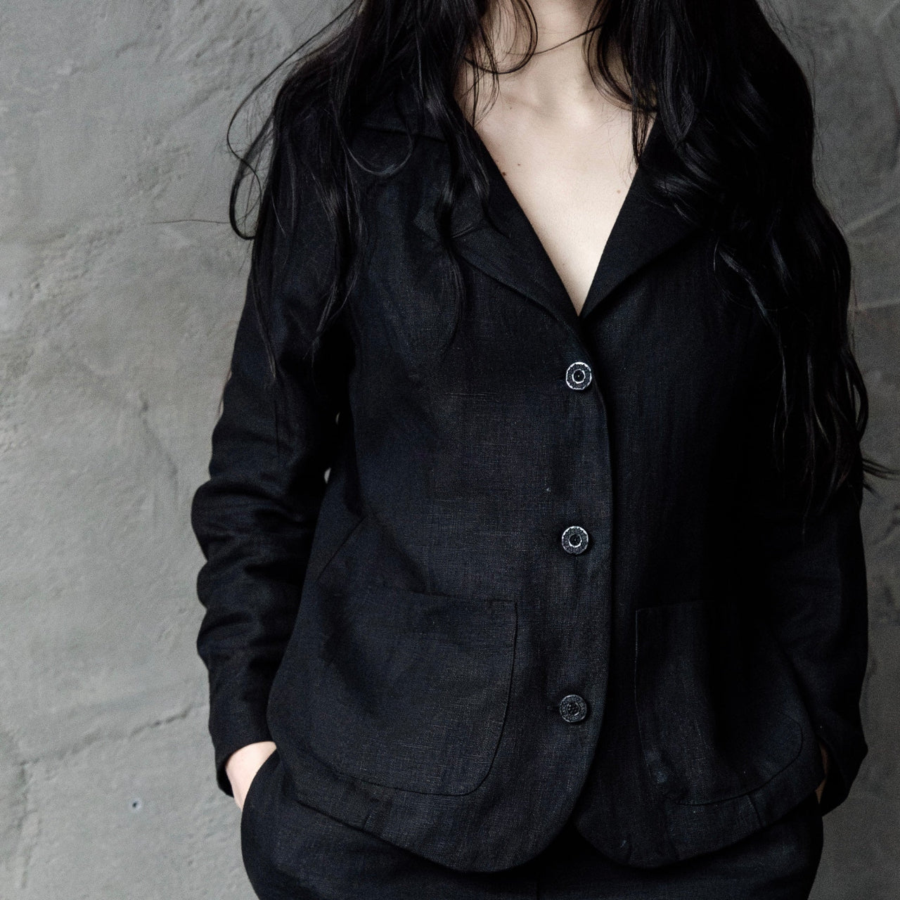 Eleganta, taču vienlaikus brīvi nēsājama - melnā lina žakete NAKTS ir radīta tiem, kuri novērtēs dabīgu materiālu, kvalitāti un niansētu stilu. Taisns piegriezums ar klasiskiem atlokiem un lielām pogām piešķir žaketei izsmalcinātu vienkāršību. Lina žakete viegli kombinējama būs gan ikdienas skrējienam, gan svētkiem.