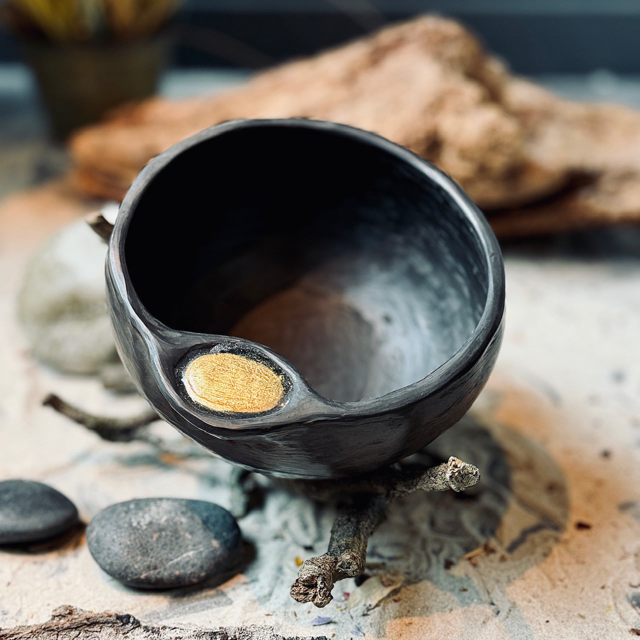 Šī melnās keramikas bļoda ir īpaša, jo tās ārmalā ir iestrādāts zelta grauds, kas pārliets ar epoksīdu. Bļoda darināta ar rokām no Latvijas māla bez podniecības ripas. Apdedzināta malkas ceplī 1000°C temperatūrā, 12 stundu ilgais apdedzināšanas process traukus padara izturīgus un praktiski lietojamus ikdienā.