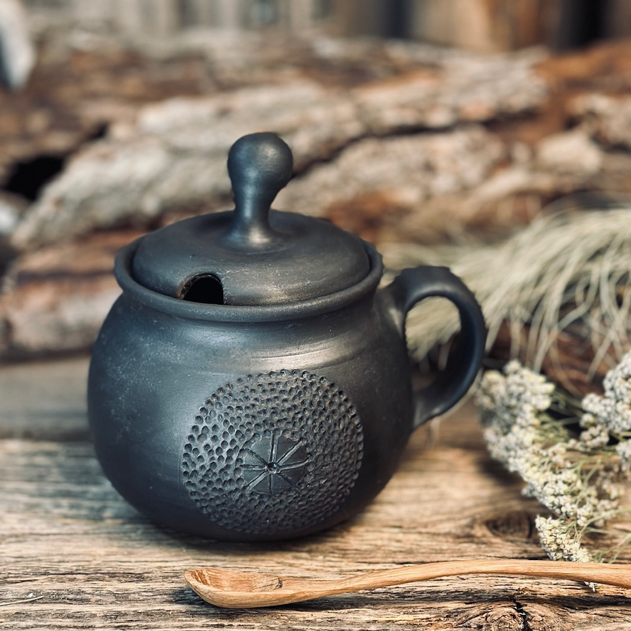 Veidots uz podnieka ripas no Latvijas māla, apdedzināts atklātas uguns krāsnī melnās keramikas apstrādes tehnikā.