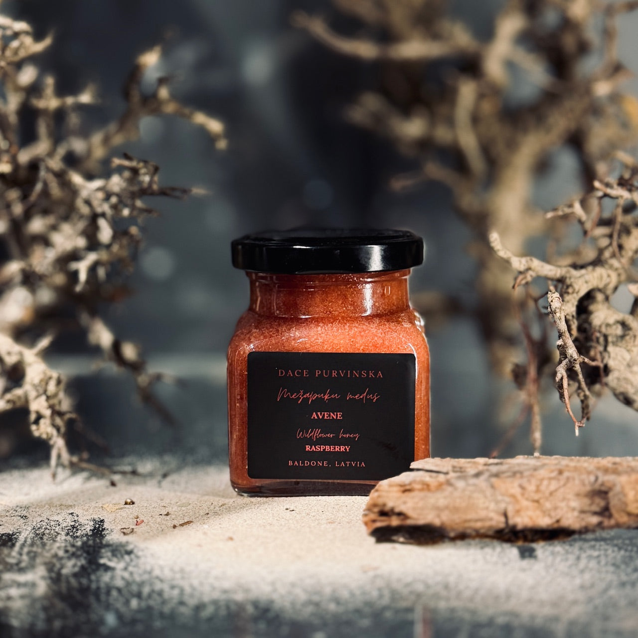 95% medus, 5% aukstumā kaltētas maltas avenes