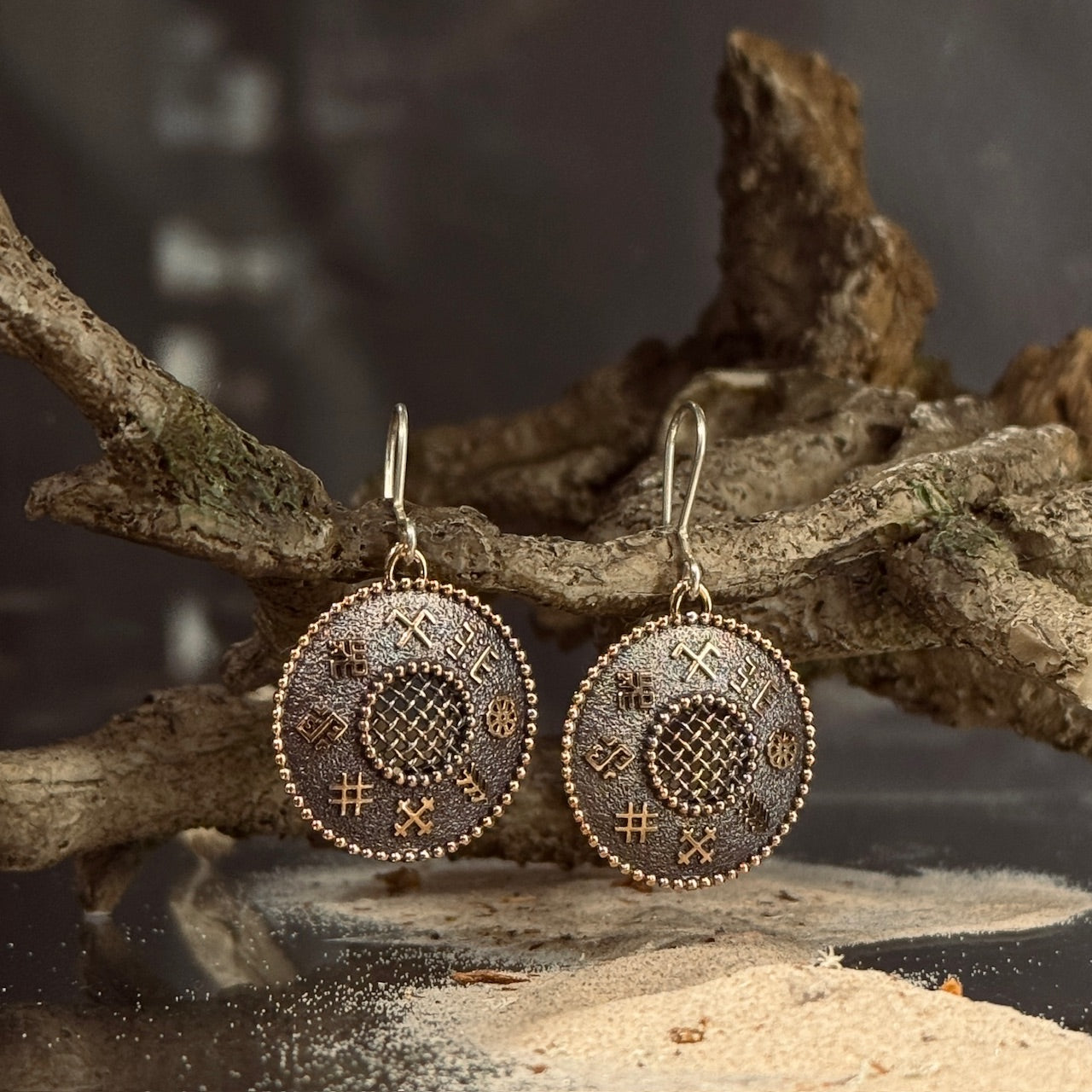 Izgatavoti no silti tonētas, oksidētas bronzas. Auskari veidoti apaļā, medaljona formā, kas simbolizē pilnību un nepārtrauktu kustību - gluži kā saule savā ikdienas ritējumā debesu lokā. Apļa centrā atrodas smalka, reljefa struktūra, kas atgādina Saules satru savijumu, dzīvības tīklu.