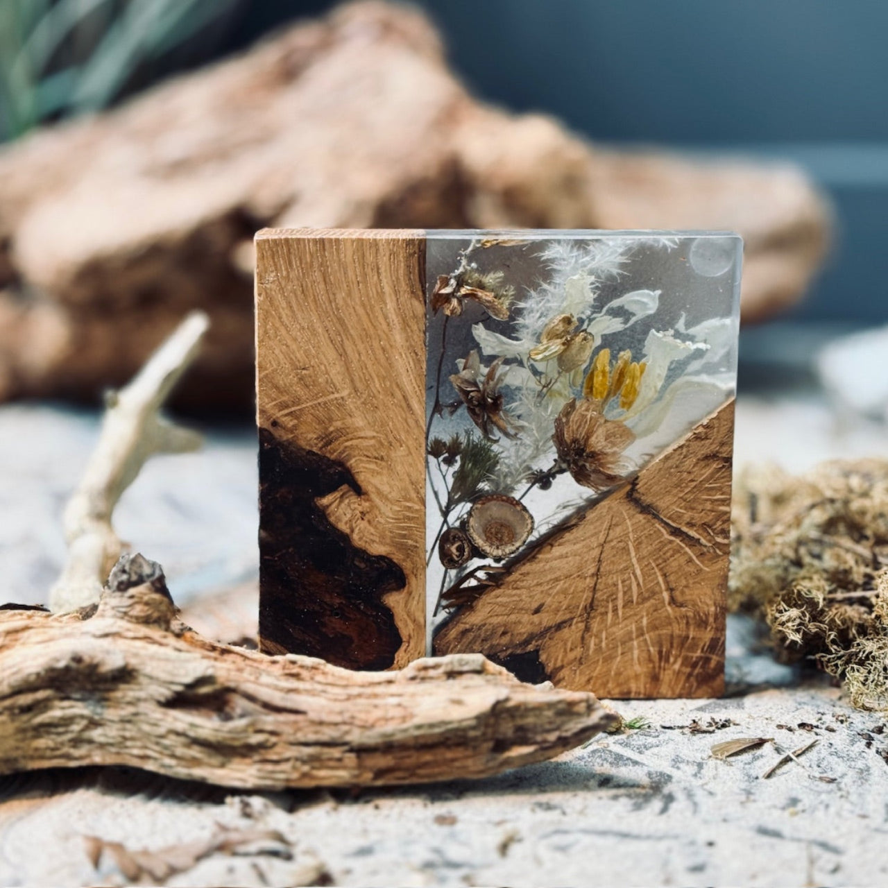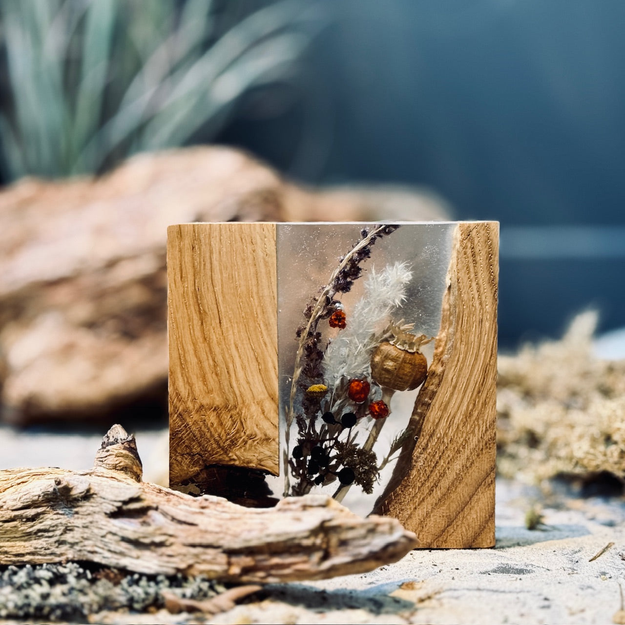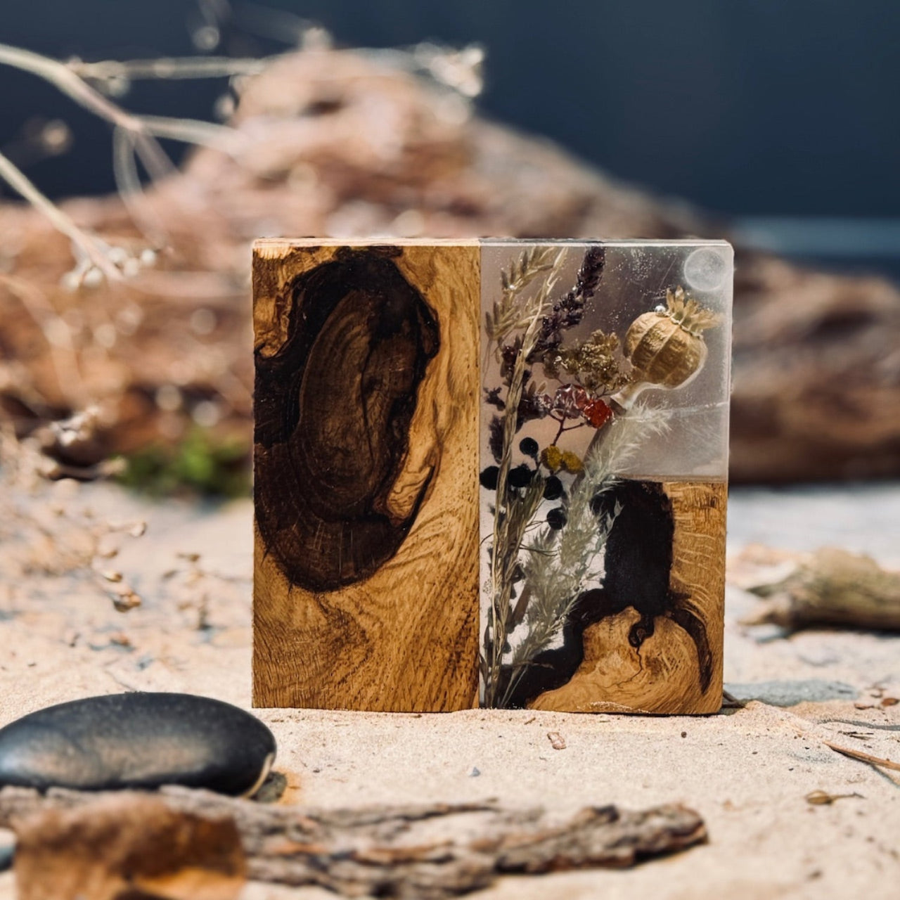 Ozolkoka paliknī harmoniski sapludināti epoksīda sveķi, kuros iekapsulēti īsti dabas augi, radot dabas tuvuma sajūtu katrā detaļā.