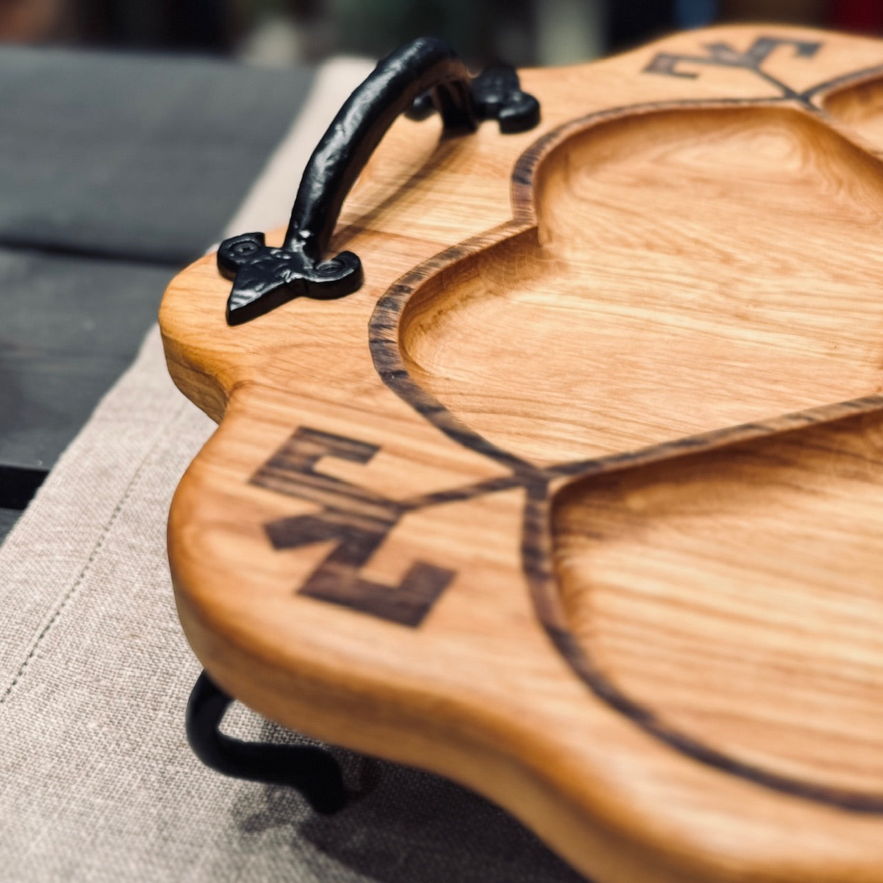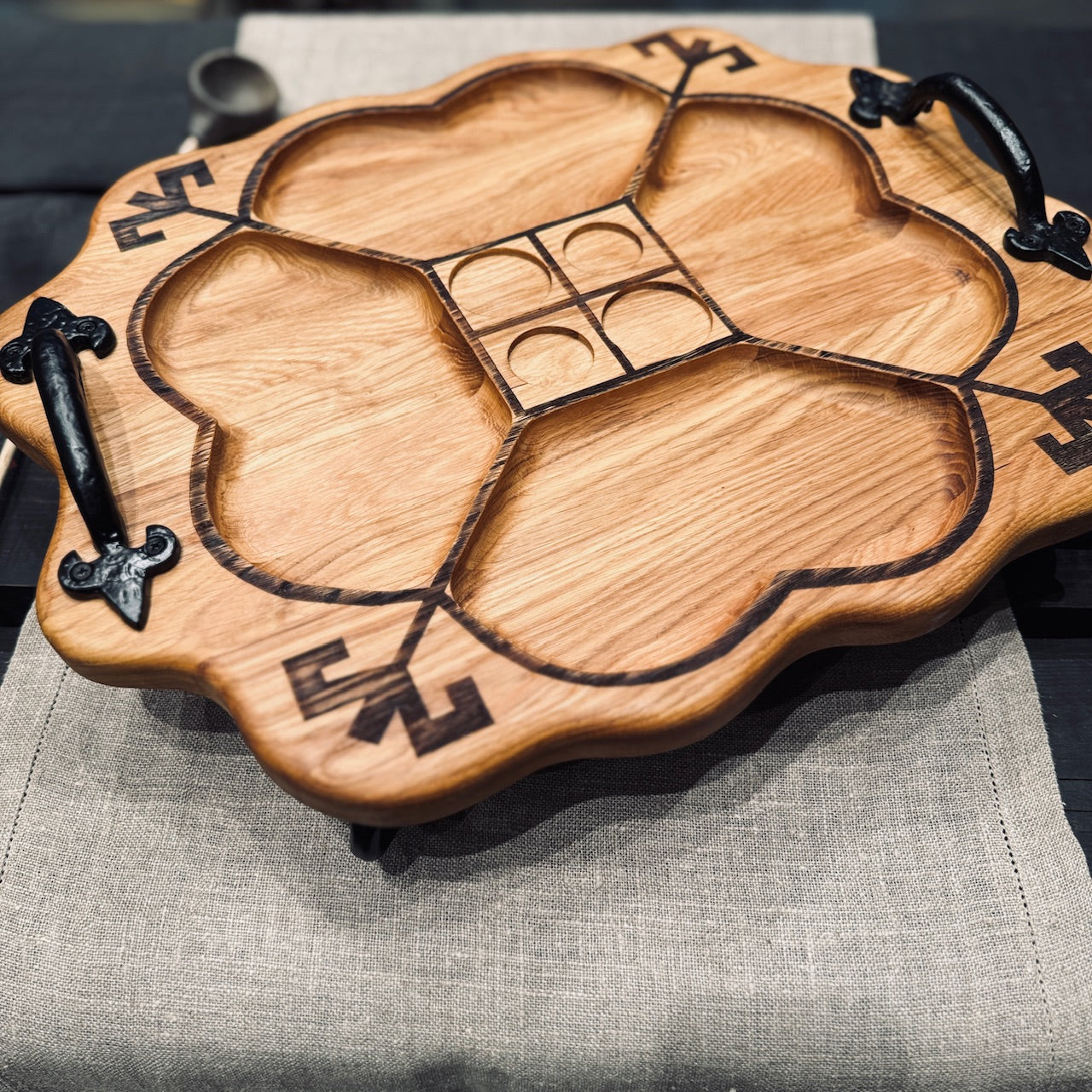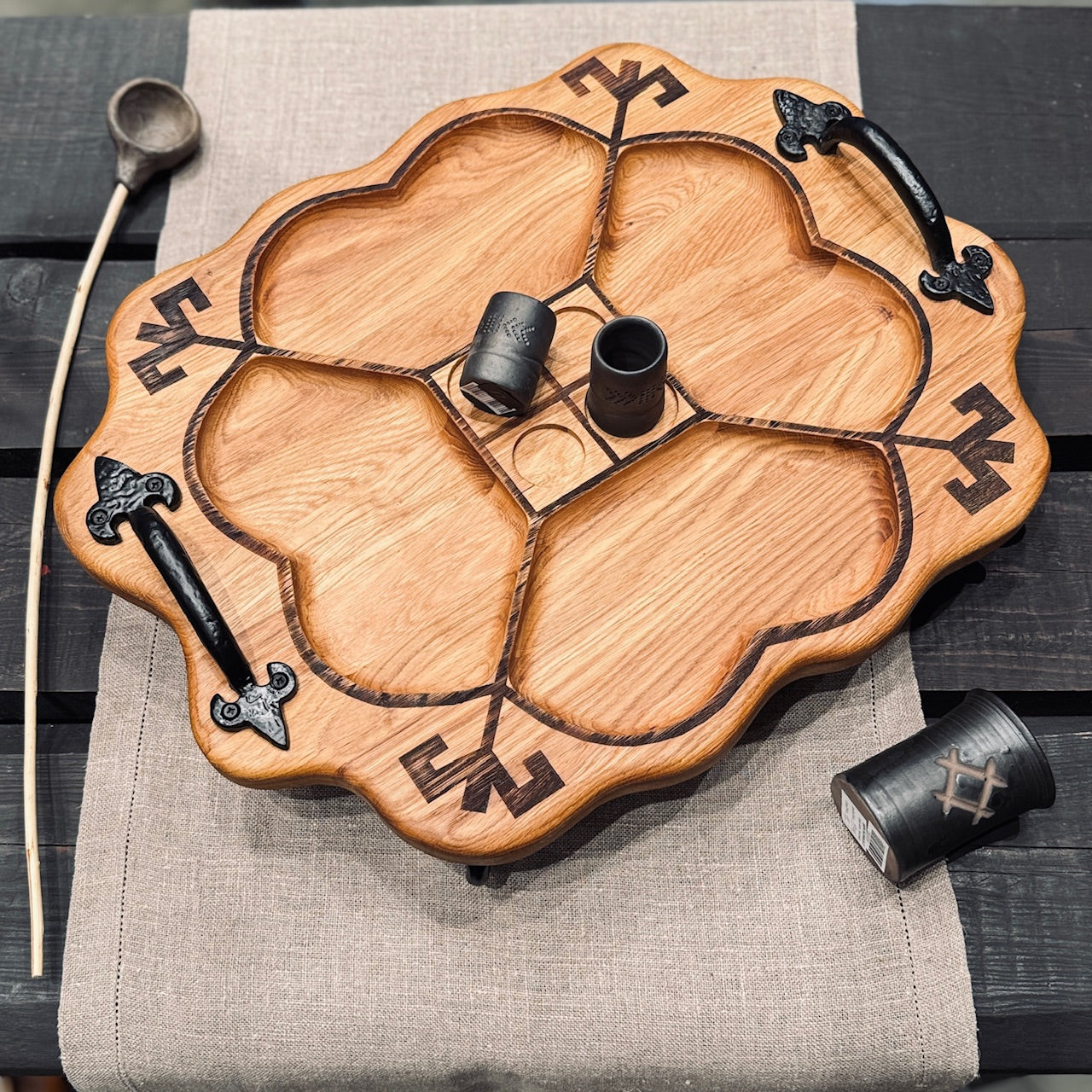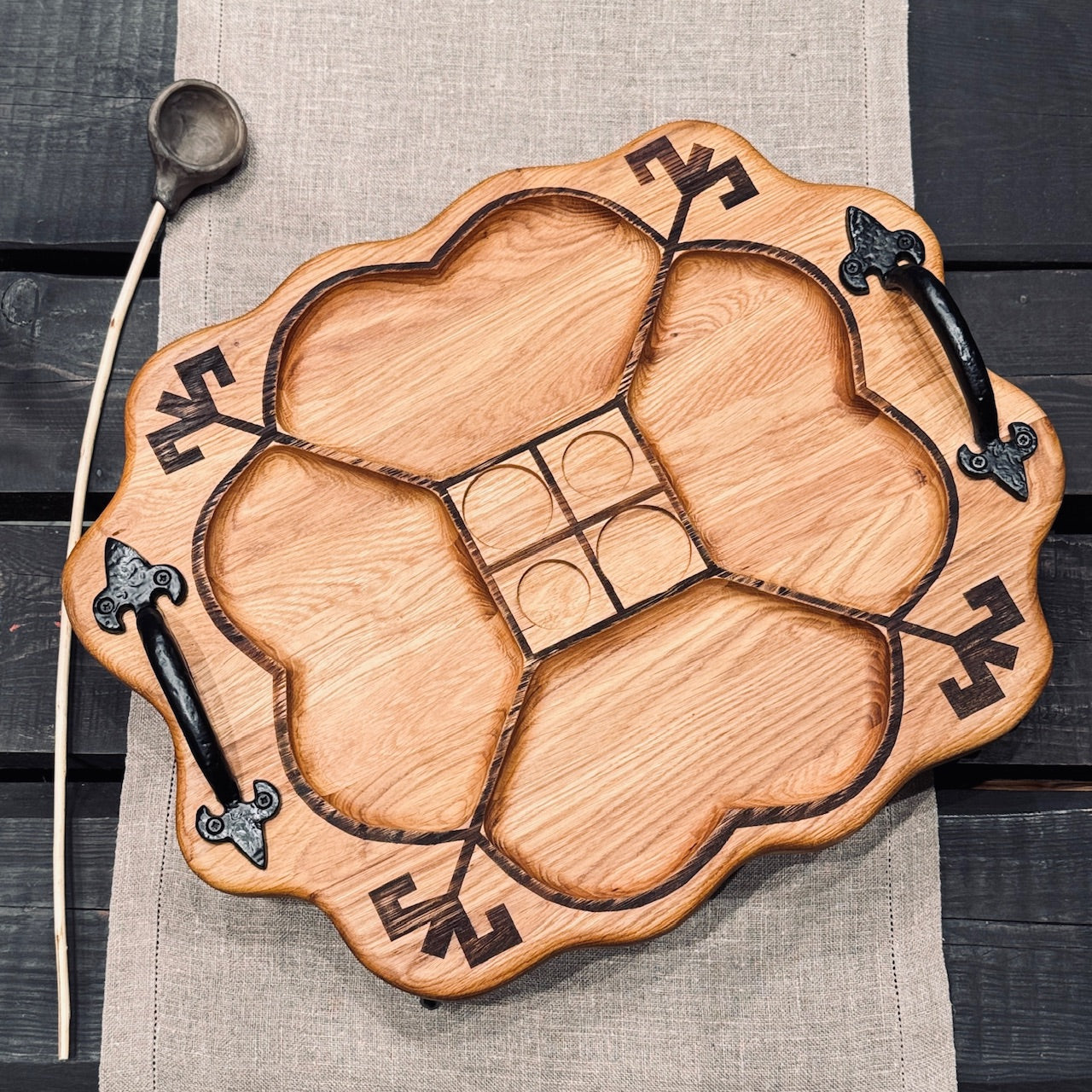 Paplātes formā un dalījumā iestrādāta Saules zīme, kas latviešu kultūrā simbolizē gaismu, dzīvību, siltumu un atjaunošanos. Tā piešķir paplātei īpašu enerģiju un padara to par unikālu interjera un servēšanas akcentu.