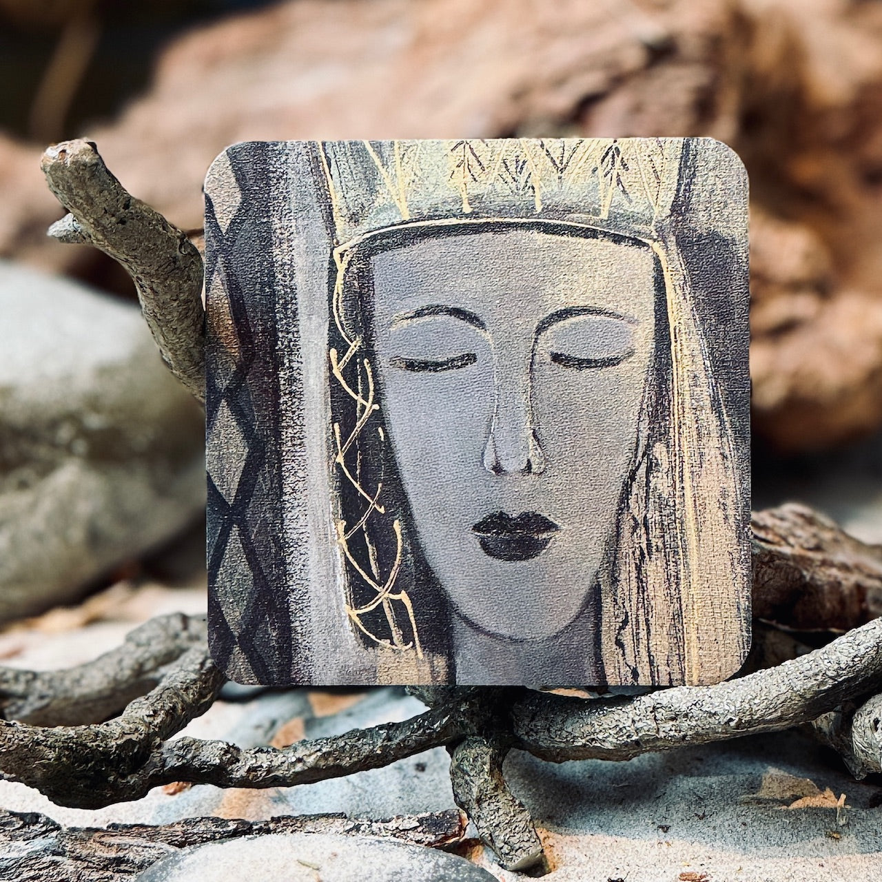 Stilizēts tautu meitas attēlojums. Kvalitatīva apdruka. Neuzkrītoš, bet ideisks paliktnītis, kas var izdaiļot galdu.