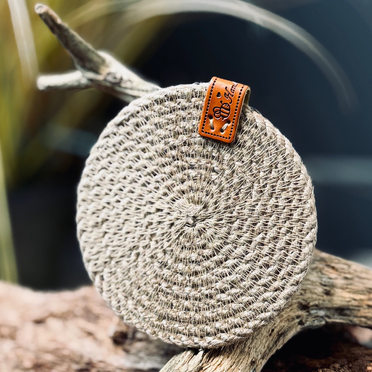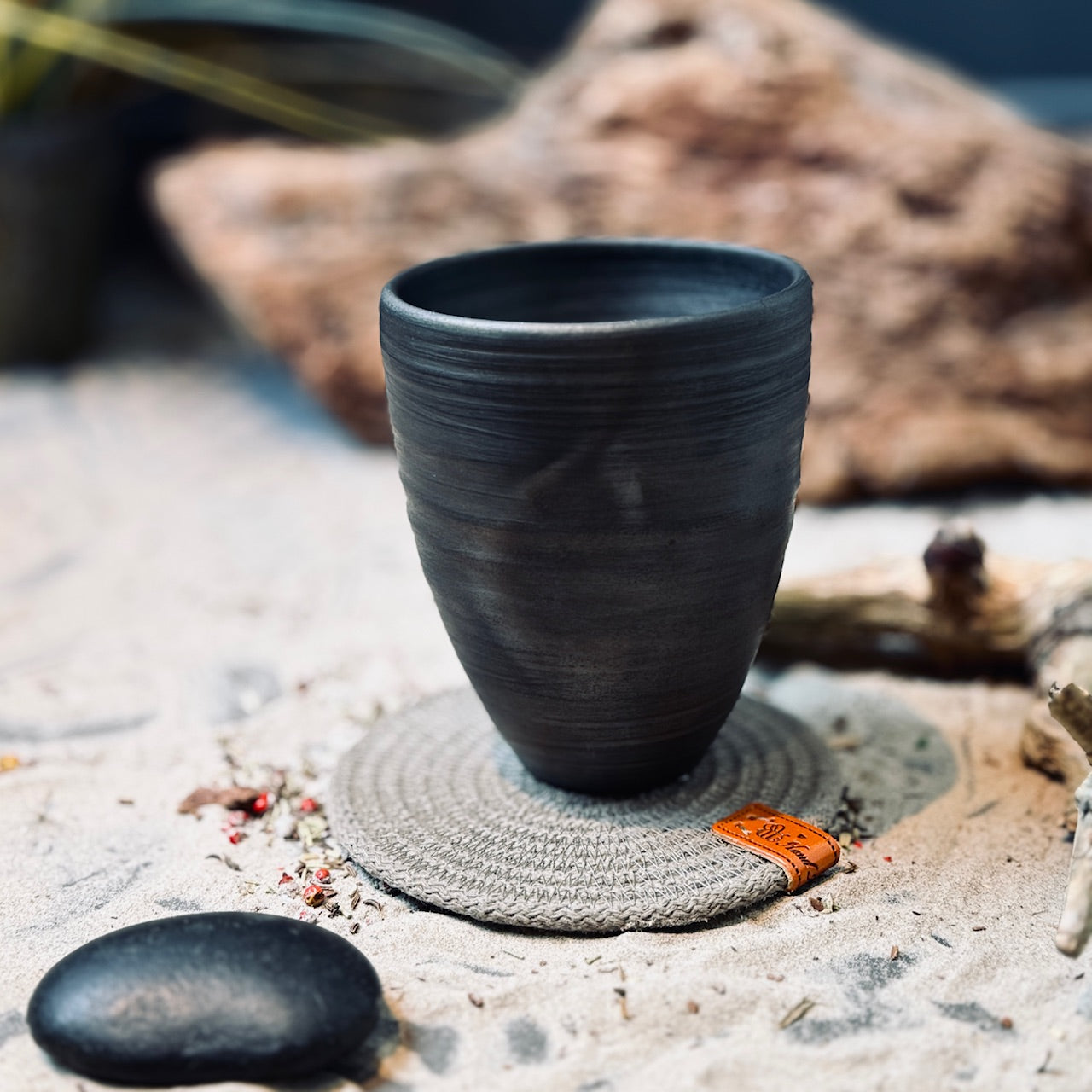 Krūžu un glāzū palikņi, kas ir pīti un veidoti no virves, nostiprināti ar ādas birciņu.