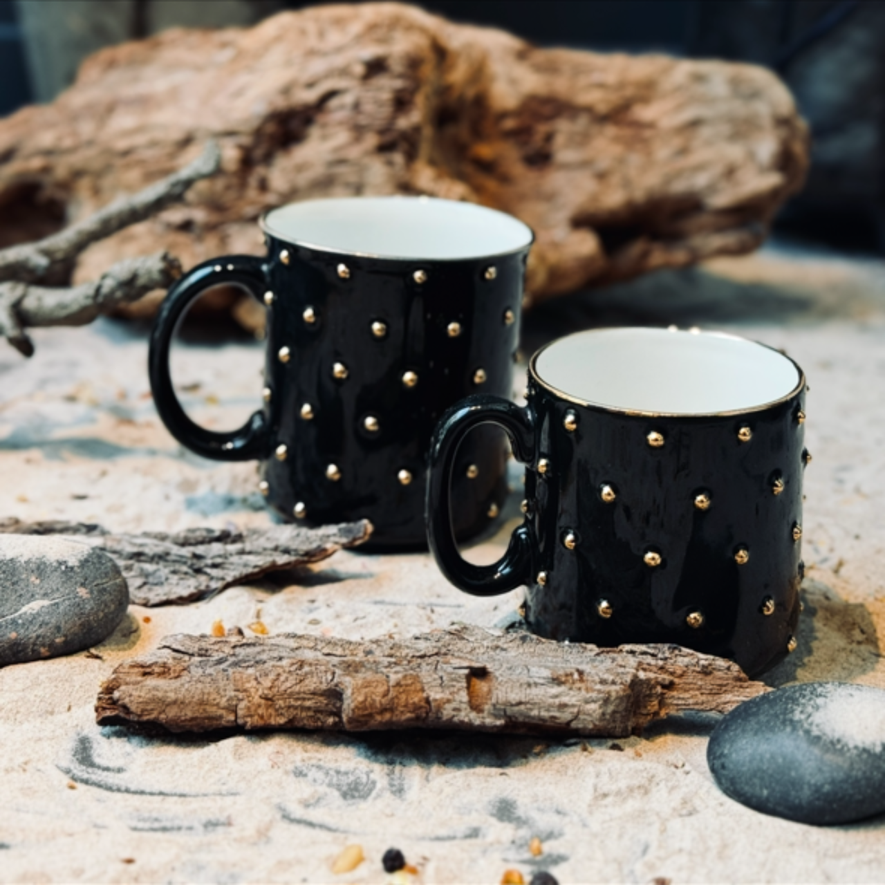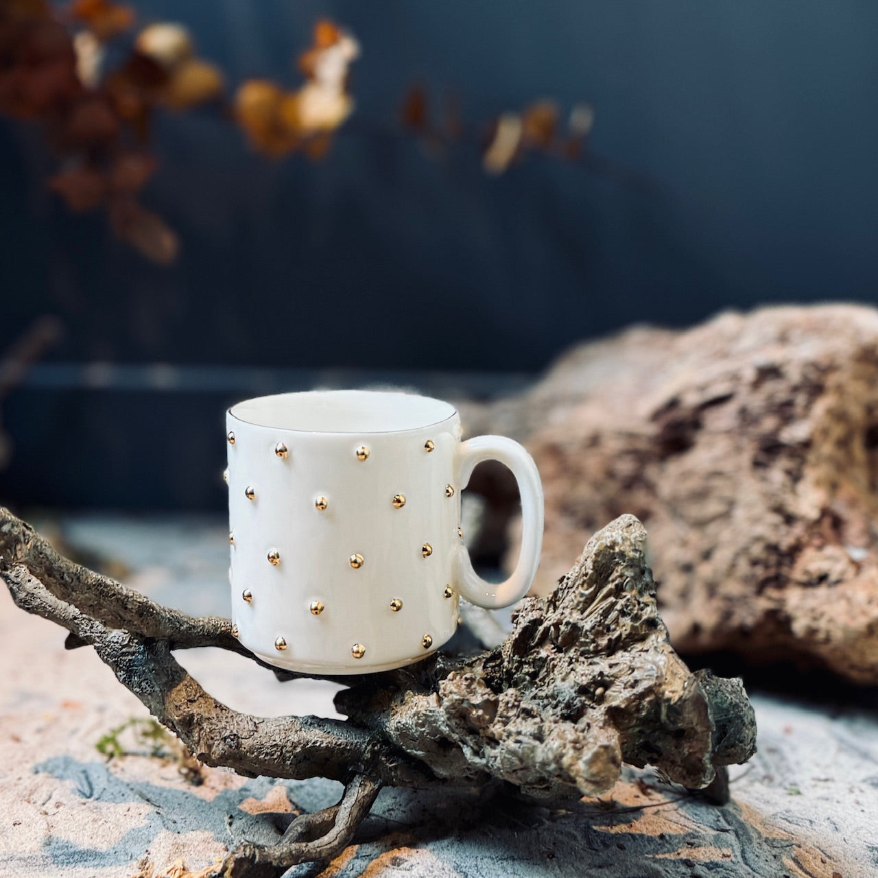 Šīs elegantās krūzes ir roku darbs, kas tapis no Mont Blank porcelāna. Tās ir atlietas ģipša formā, savukārt katra katra mazā pumpiņa ir pielikta atsevišķi un vēlāk pārklāta ar zeltu. Krūzes ir dedzinātas trīs reizes maksimālajā temperatūrā 1280°C, kopumā krāsnī pavadot 70 stundas. Caurspīdīgā un krāsainā glazūra ir droša lietošanai pārtikas produktiem, turklāt tā neļauj uzsūkt pārtikas aromātus. Krūze būs piemērota gan kafijas, gan tējas baudīšanai, un, saudzīgi to lietojot, tā var kļūt pat par ģimenes relikviju, kas tiek nodota no paaudzes paaudzei.