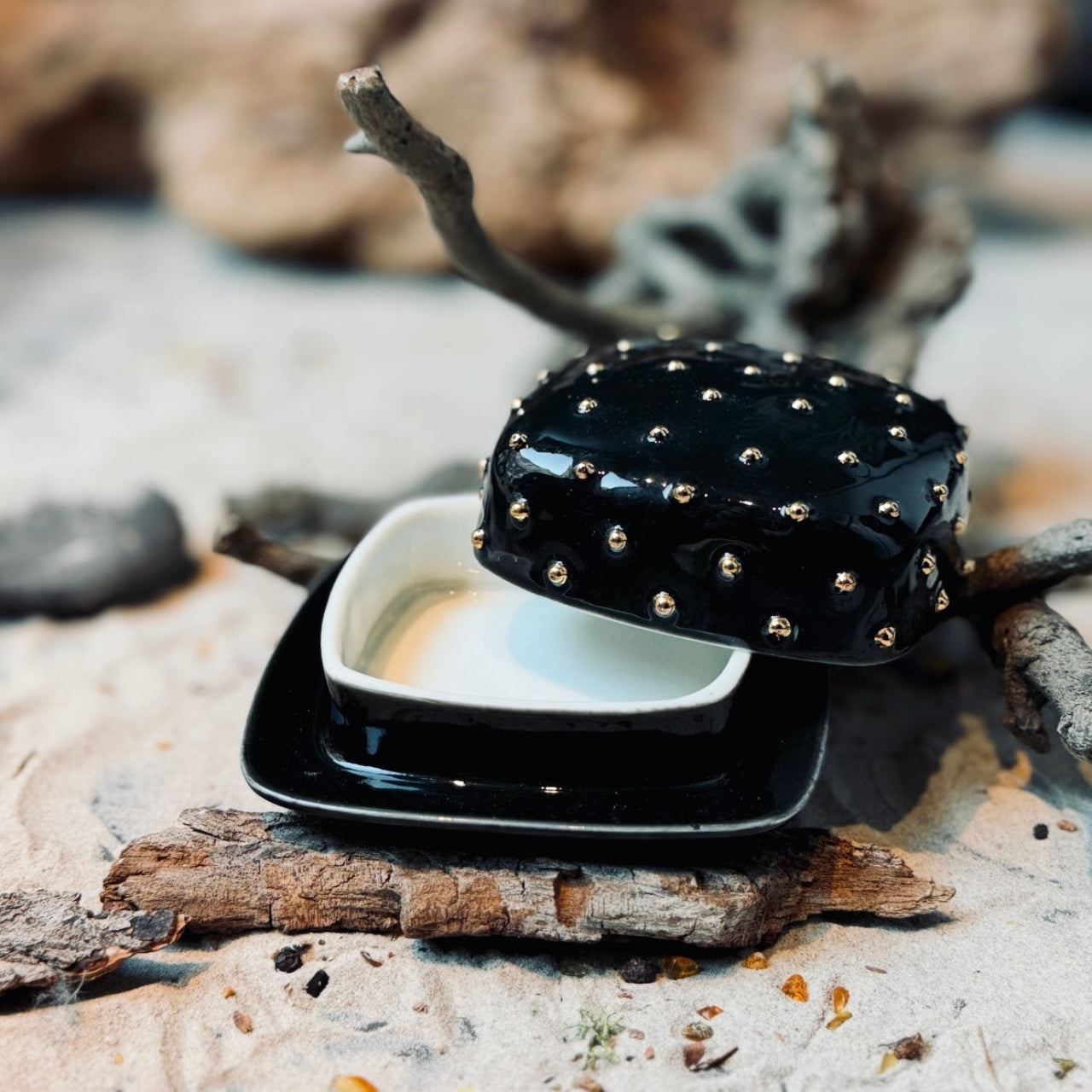 Eleganti porcelāna trauki ar zelta pārklājumu, kas būs piemēroti gan sviesta (100g), gan ikru (100g) glabāšanai un pasniegšanai.
