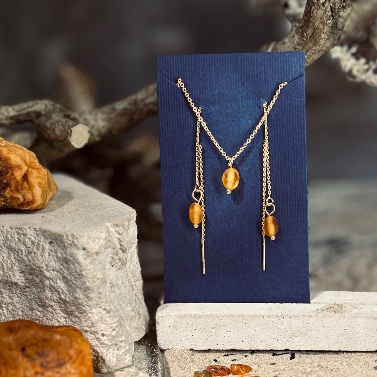 Dzintara rotu komplekti sastāv no auskariem un kulona ar īstiem Baltijas dzintara akmentiņiem - katrs ar savu unikālu toni un formu. Saules pielietie dzintari mirdz no zelta līdz siltam konjakam, kā atgādinājums par jūras klusumu, vēja stāstiem un dabas brīnumu.