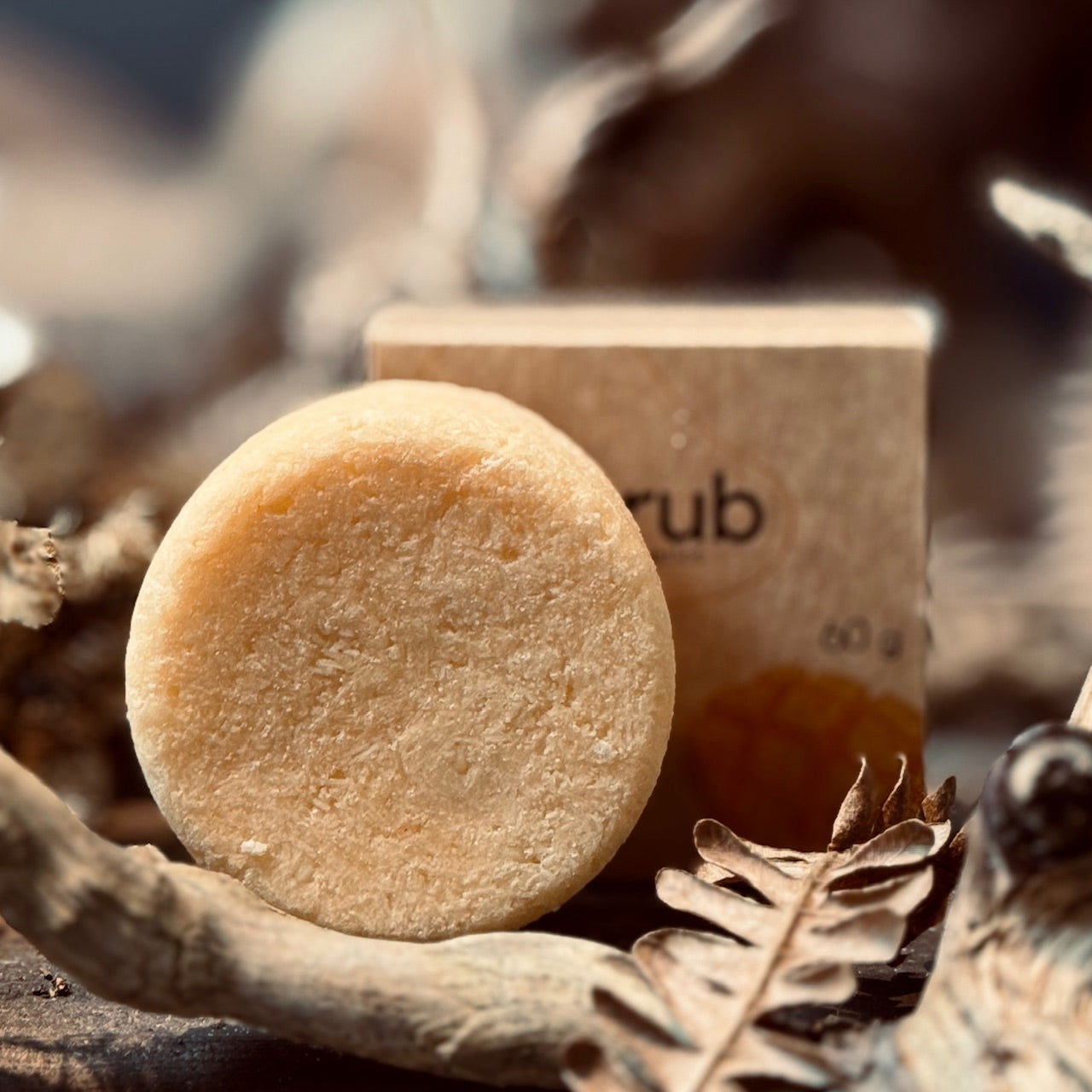 Mango 2in1 šampūnziepes maigi attīra un aizsargā matus, padarot tos zīdainus un viegli ķemmējamus. Visa SKRUB COSMETICS šampūnziepju līnija ir draudzīgāka videi nekā parastie, veikalos nopērkamie šampūni, jo tiek izmantots kartona iepakojums.