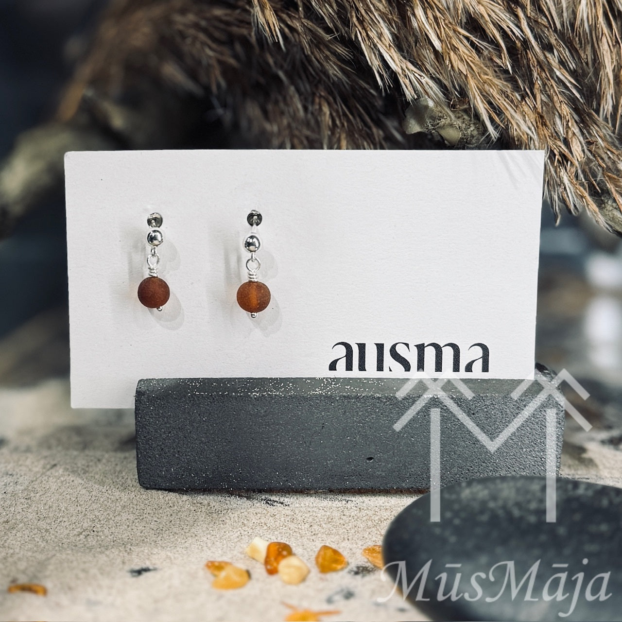 Dzintara auskari ir veidoti no neslīpēta Baltijas dzintara un sudraba.
